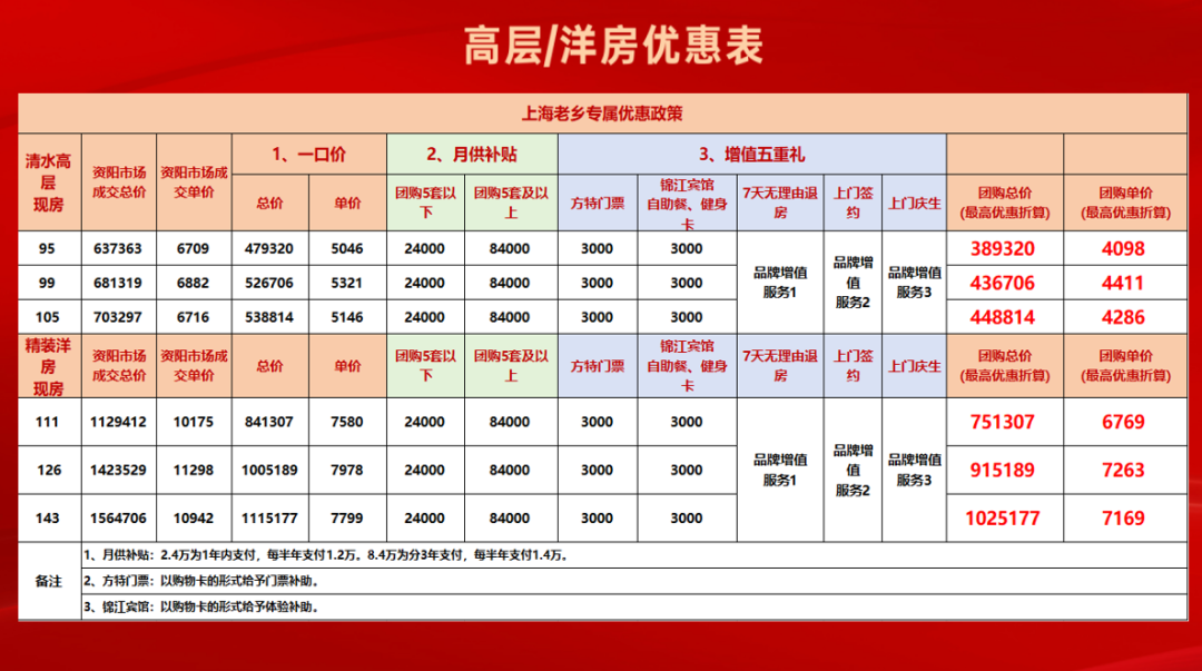 清水高层现房:95平米,市场成交单价6709元,销售总价637363元,最高优惠折算389320元,优惠后团购单价只需4098元;105平米,市场成交单价6716元,销售总价703297元,最高优惠折算448814元,优惠后团购单价只需4286元;