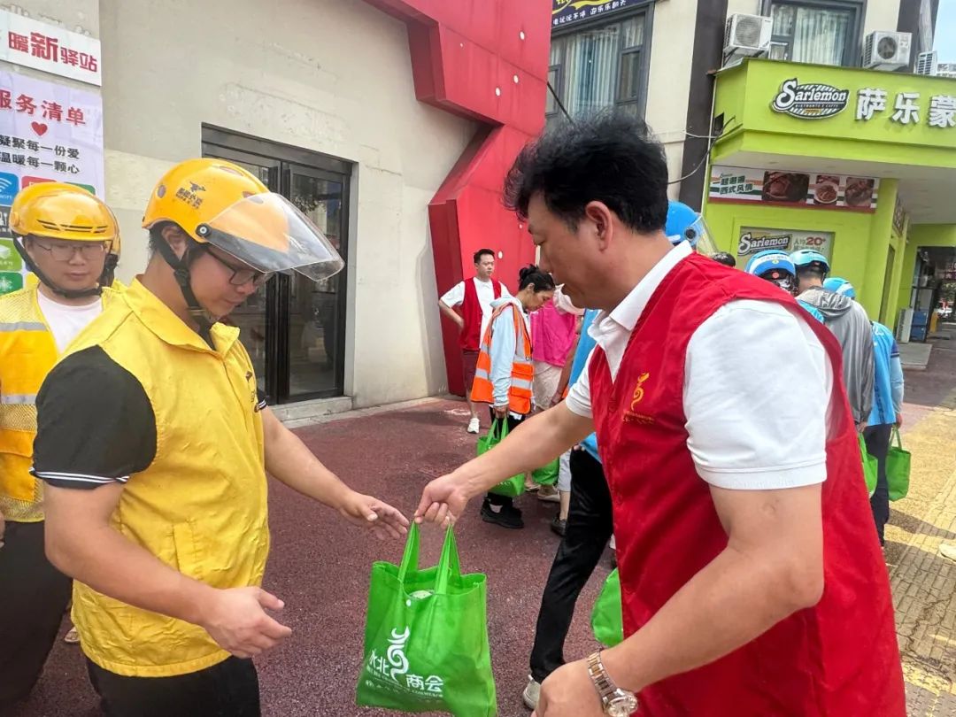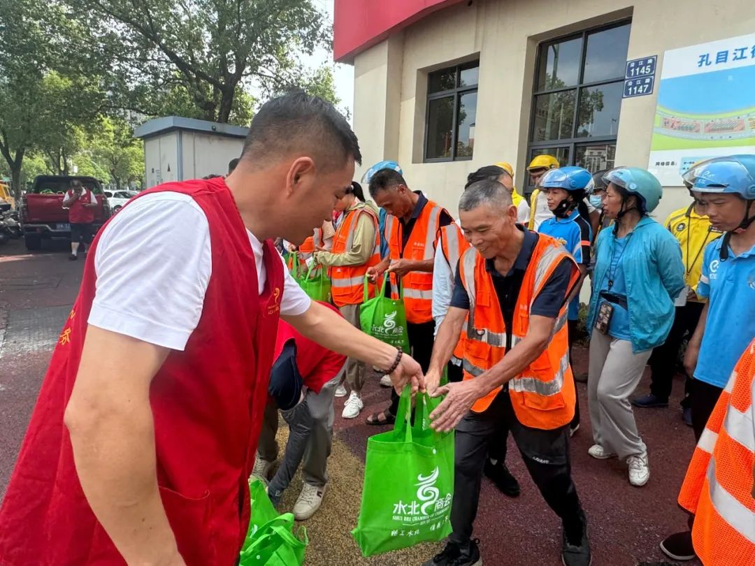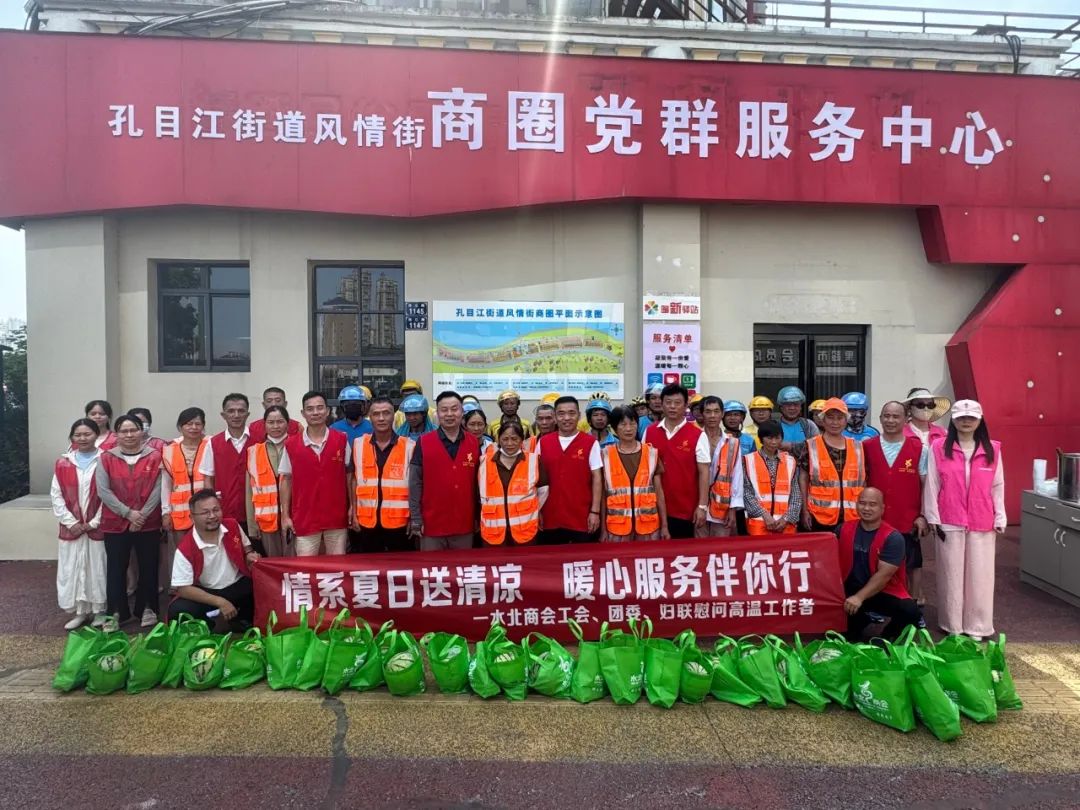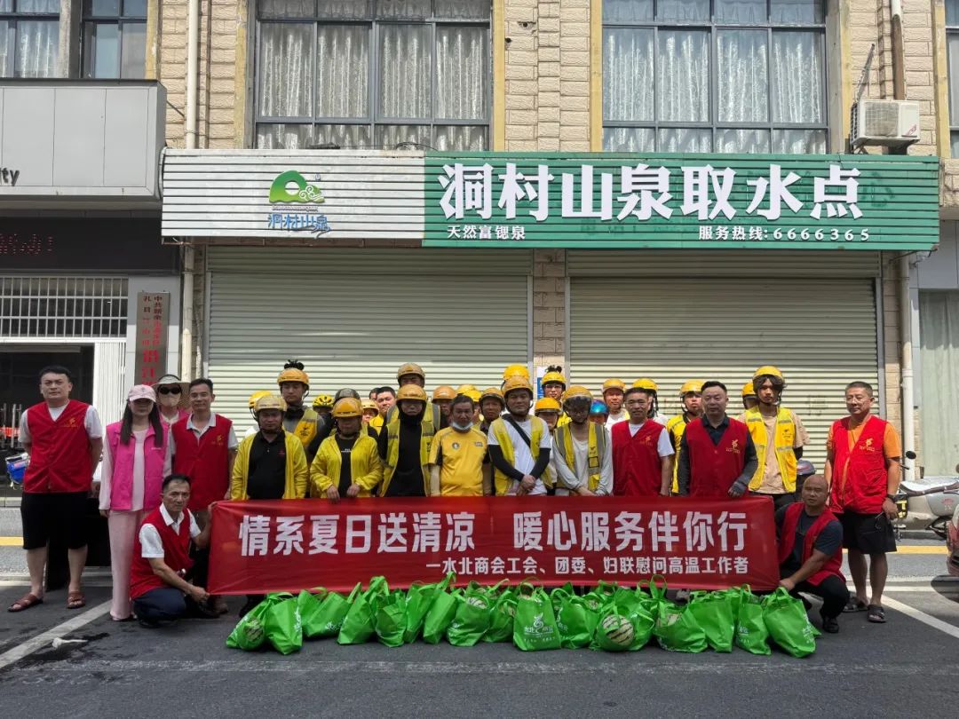 为切实关爱户外工作者身体健康,7月16日上午,水北商会副会长钱细平、秘书长傅小勇组织商会工会、团委、妇联开展“情系夏日送清凉 暖心服务伴我行”高温工作者慰问活动。向不畏酷暑、坚守岗位的一线劳动者表达深切关怀与崇高敬意。为他们送去夏日里的清凉。