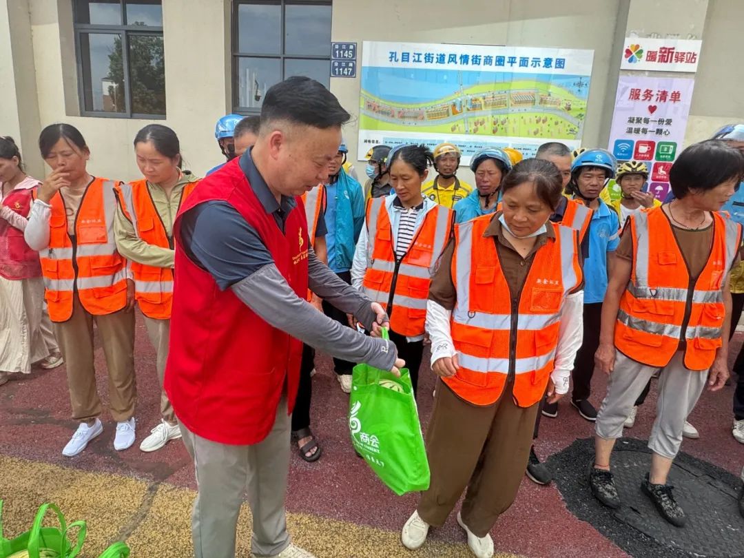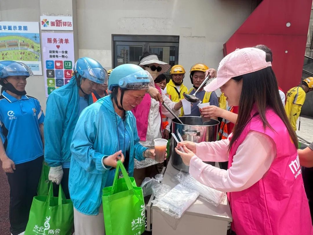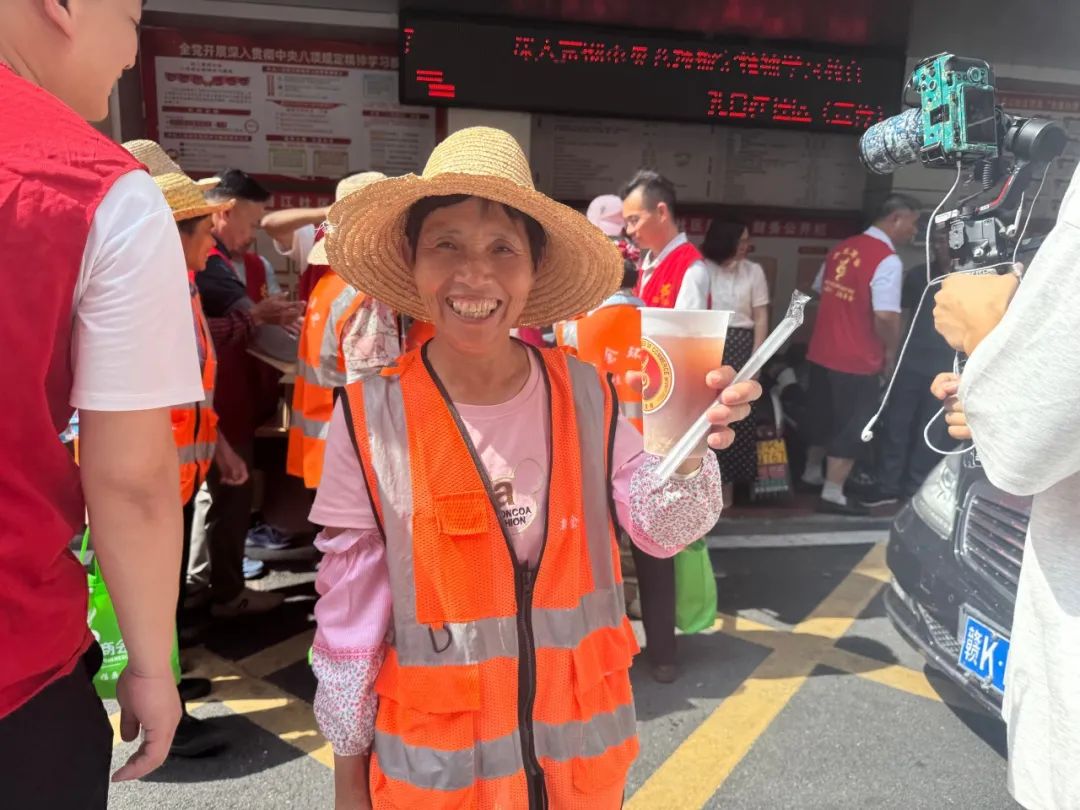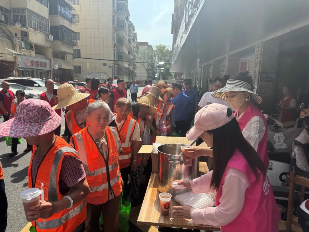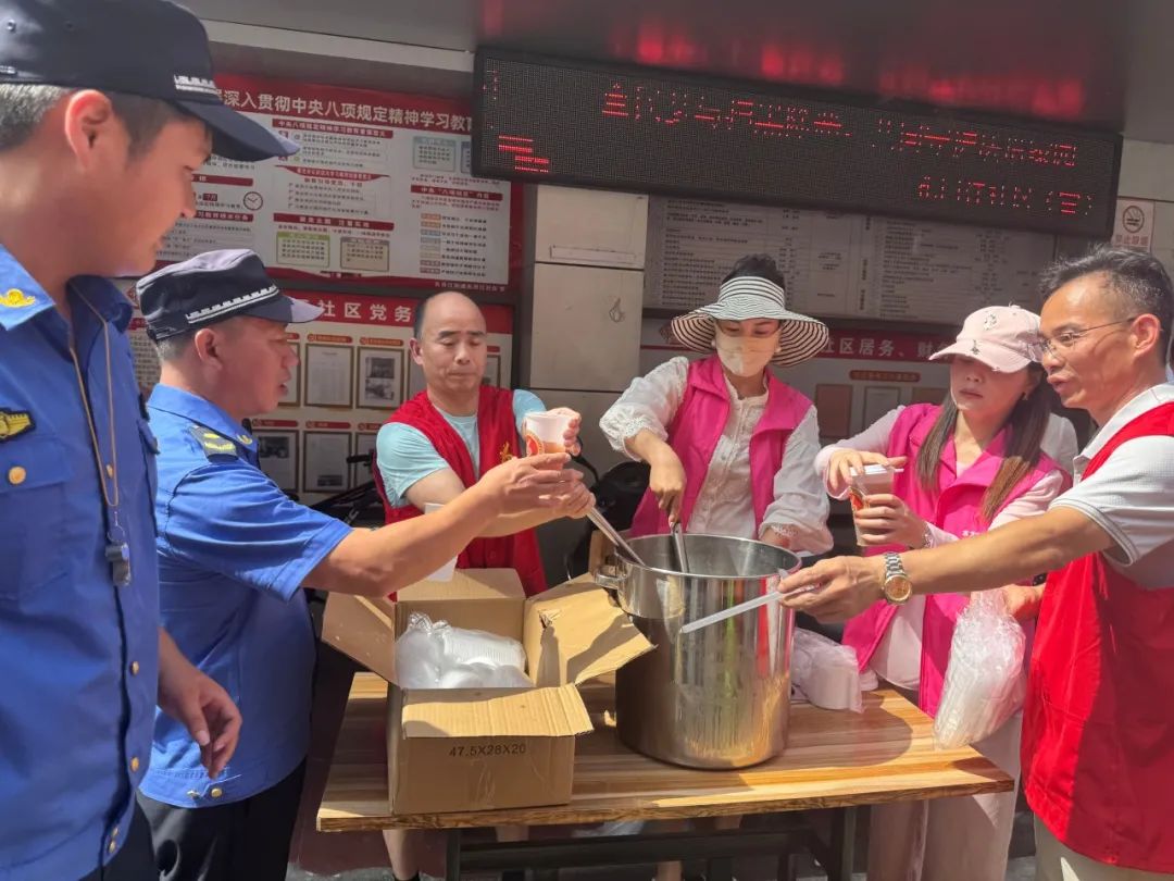 活动期间,水北商会慰问团队分别前往孔目江社区、沿江路红色驿站以及沿江路社区三个服务点位,为辛勤工作的环卫工人、外卖小哥、城管协管员等高温作业群体送上精心准备的“夏日清凉礼包”(一瓶花露水+两双冰袖+一斤绿豆+一个西瓜)和商会精心熬煮的冰镇绿豆汤。本次活动共计发放“夏日清凉礼包”100份,以实际行动传递商会的关爱与温暖。