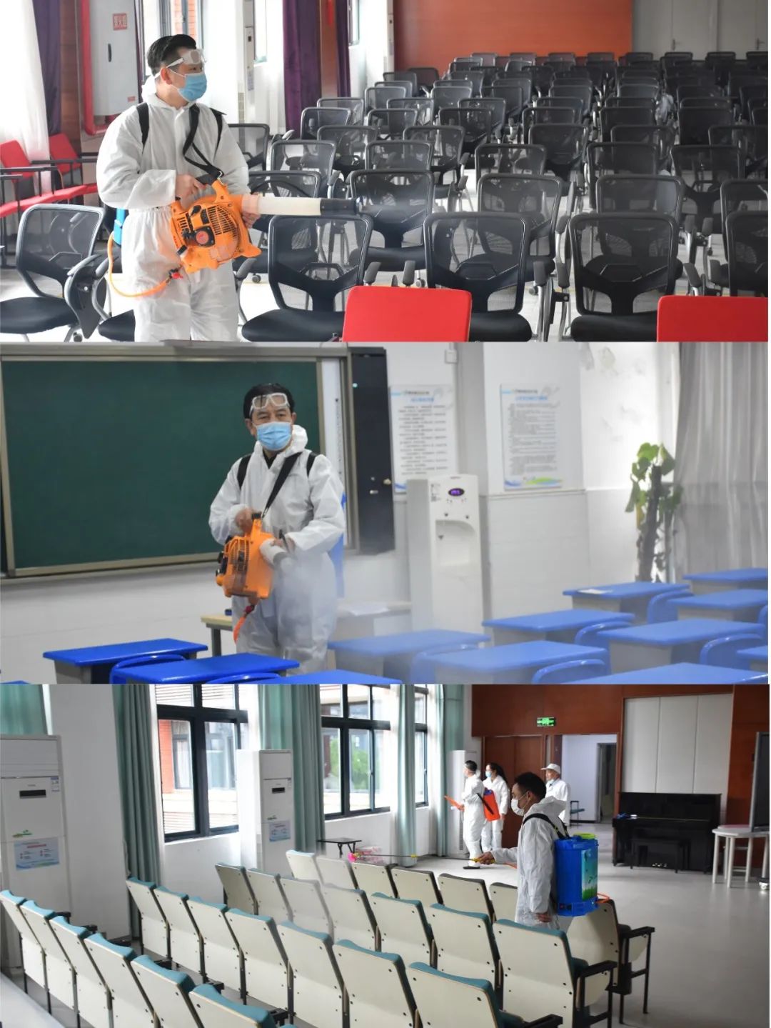 (副会长俞辉和消毒队员在教室喷洒消毒)