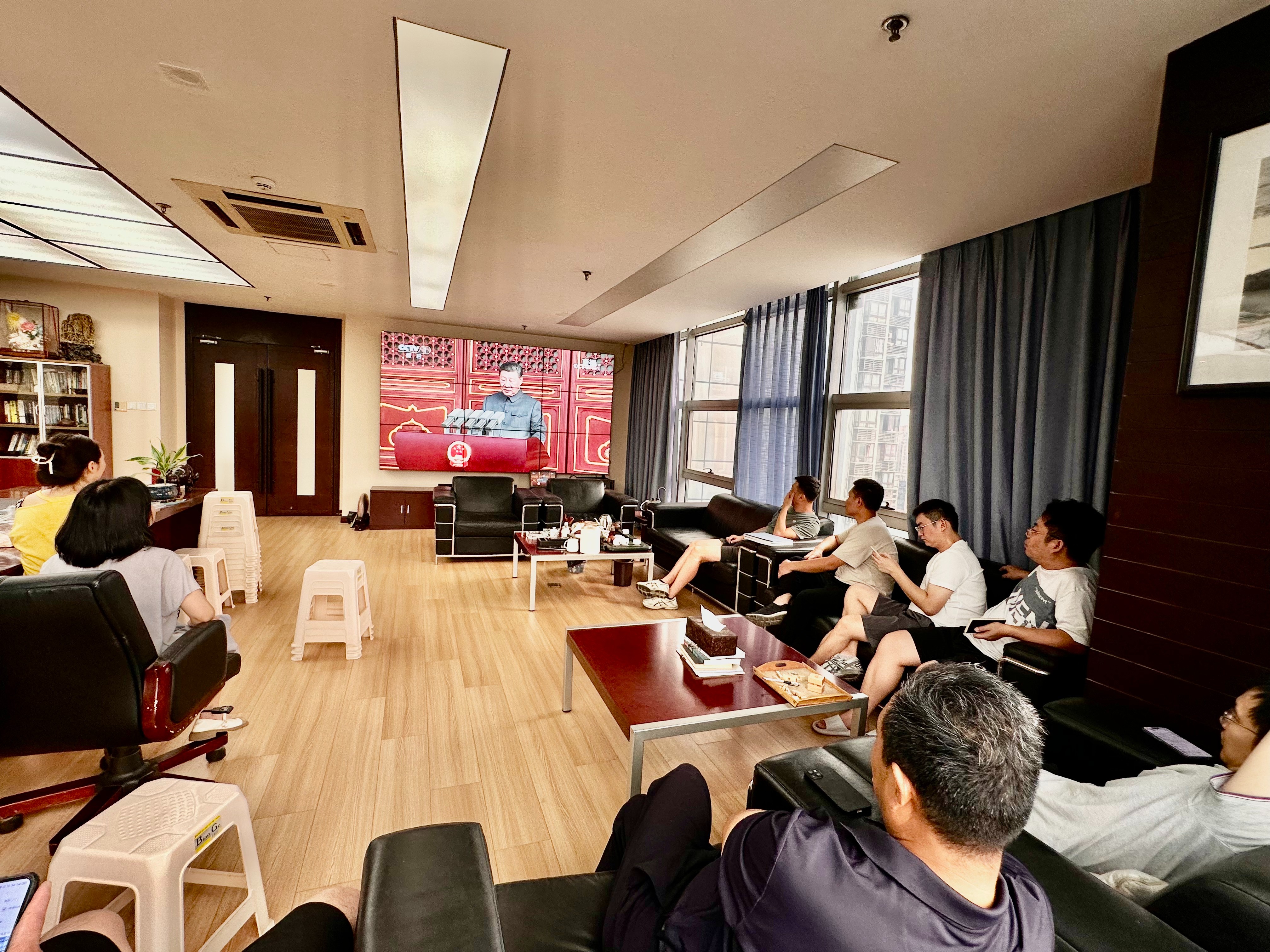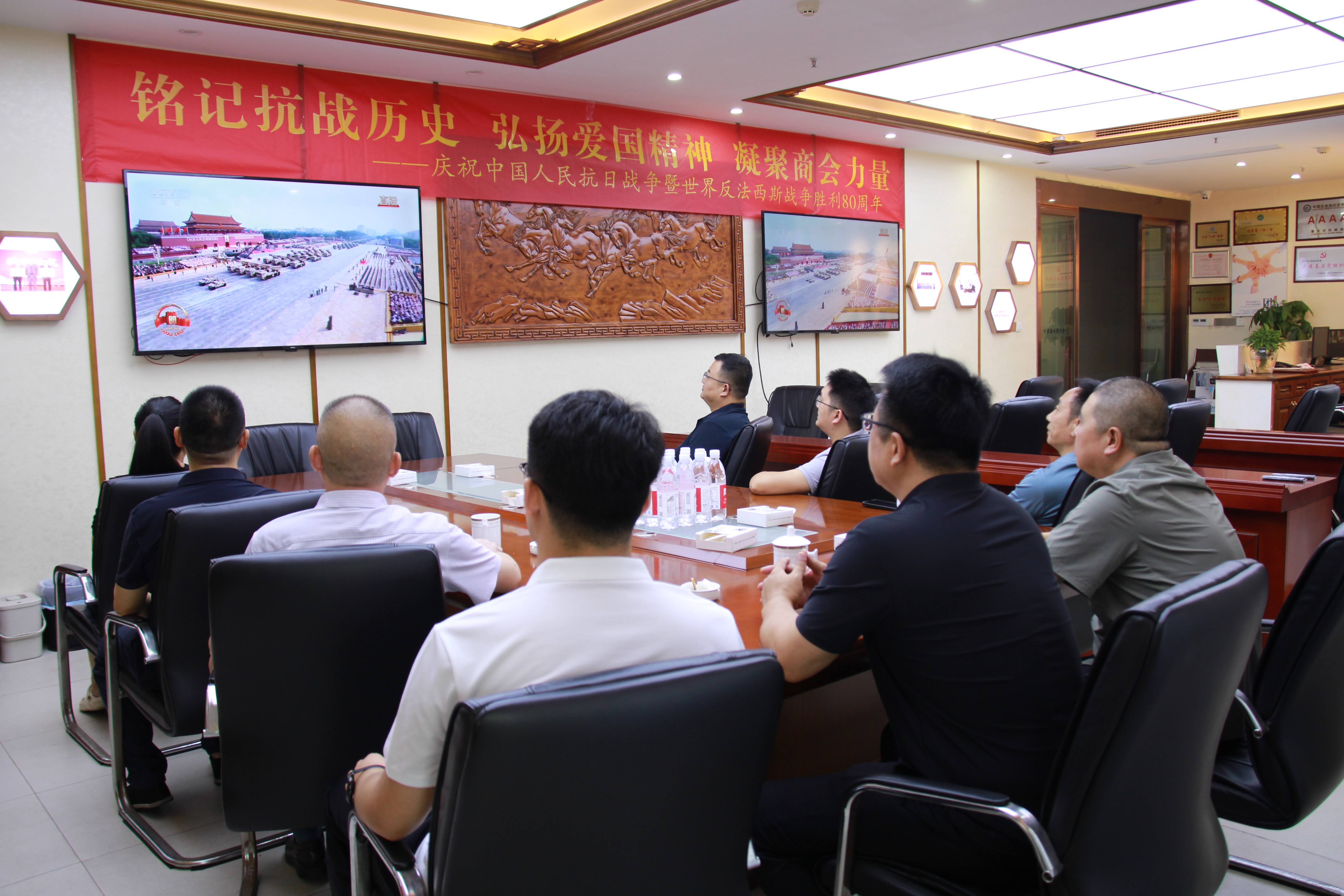在商会会议室内,来自不同地区的会员企业代表和秘书处工作人员齐聚一堂集中收看,注视着大屏幕上阅兵式的壮观场面,与会人员神情专注,不时为阅兵部队的雄壮威武鼓掌称赞,一种跨越80年的民族自豪感在每个人心中激荡。