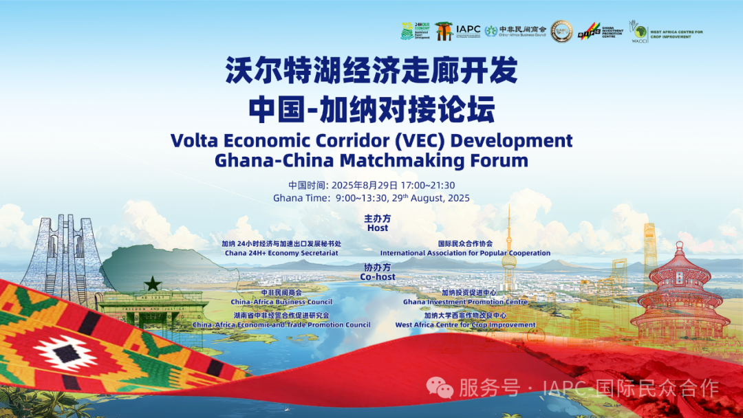 2025年8月29日,“中国-加纳沃尔特湖经济走廊开发 中国-加纳对接论坛”在加纳阿克拉和中国北京两地连线举办。论坛由加纳24小时经济与加速出口发展秘书处(简称“24小时经济秘书处”)和国际民众合作协会主办,中非民间商会、湖南省中非经贸合作促进研究会、加纳投资促进中心和加纳大学西非作物改良中心协办。