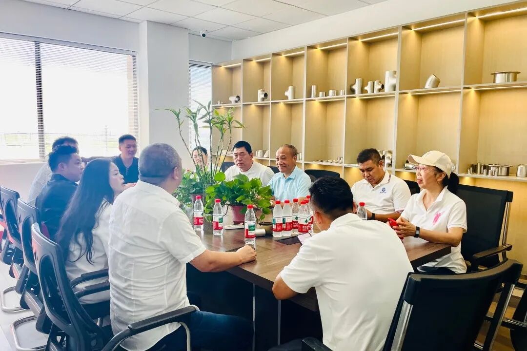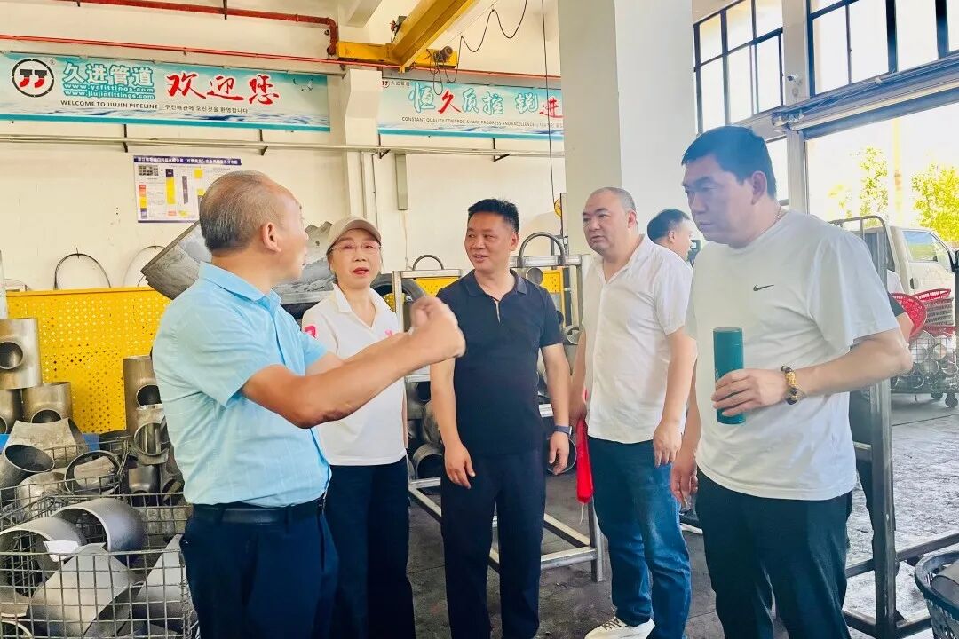随后,走访团抵达会员谭钢创办的温州久进管道有限公司。该公司以管道配件研发制造为核心,产品涵盖弯头、三通、异径管等全系列配件,尤其在镍基合金钢、哈氏合金钢、双相钢等特殊材质管道配件领域,积累了多年技术沉淀与实战经验,其产品广泛应用于石油、化工、核电等高端工业场景。在企业技术展厅,团队成员对特种合金配件的精密加工工艺与耐极端环境性能展开深入交流,谭钢详细介绍了企业在材质研发与定制化生产方面的核心优势。