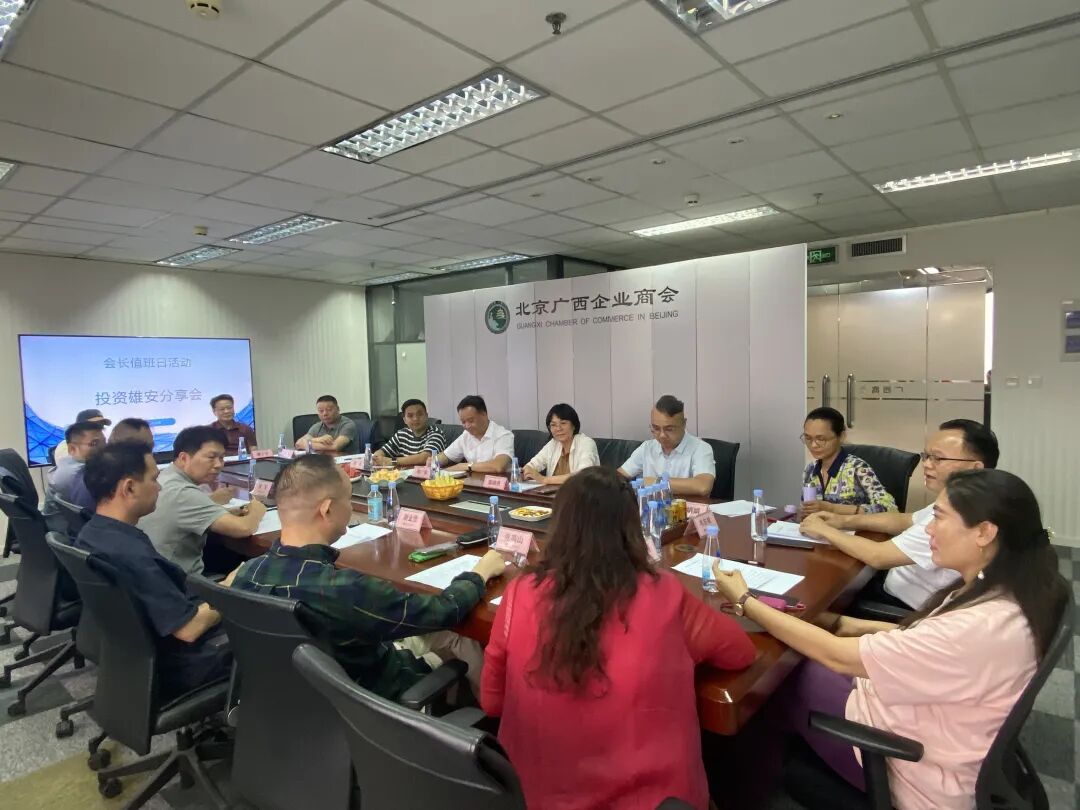 为助力商会会员企业把握雄安新区发展机遇,搭建资源共享与交流合作平台,北京广西企业商会于2025 年 9 月 5 日,在商会秘书处办公室成功举办会长值班日活动 ——投资雄安资源分享会。会议由商会秘书处负责同志主持,商会执行会长陈广强,副会长易东,秘书处负责同志等20多位理事及会员齐聚一堂,共话雄安发展新机遇,共享投资资源与经验。
