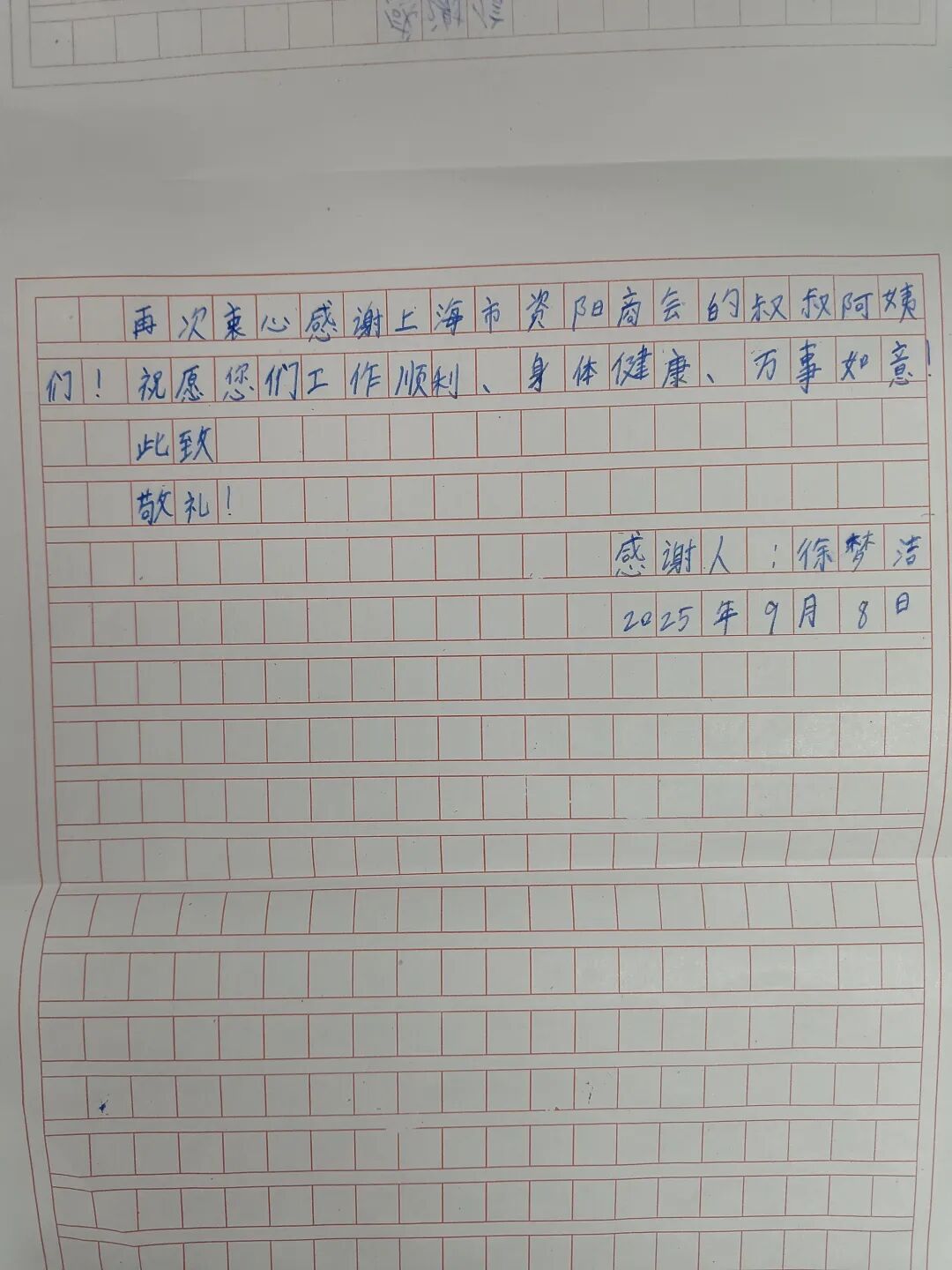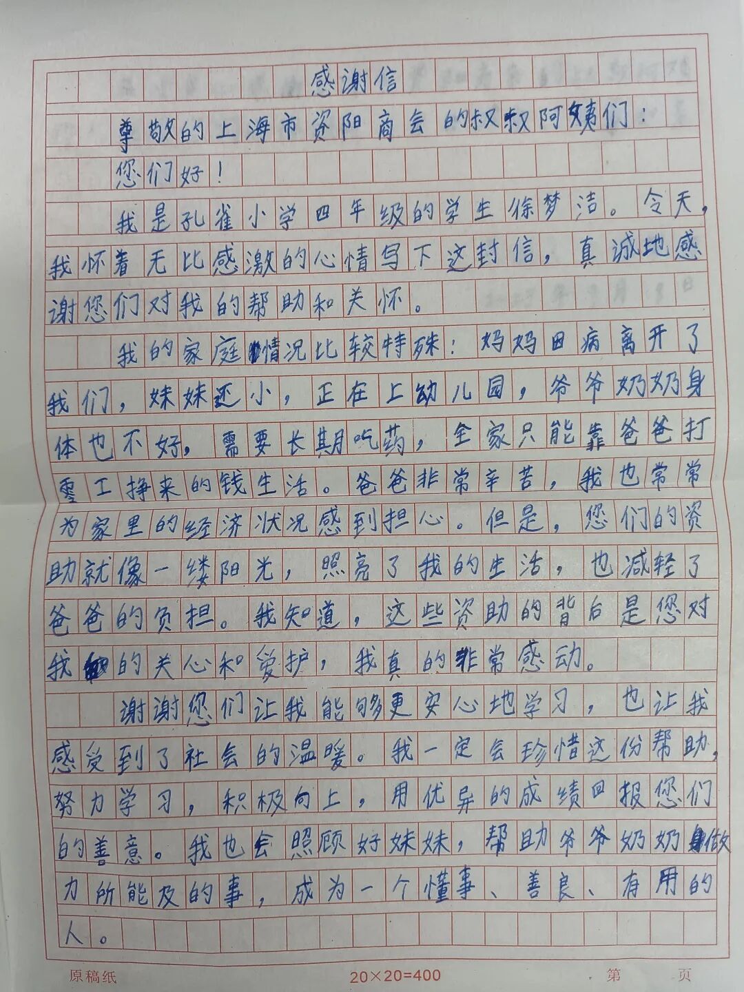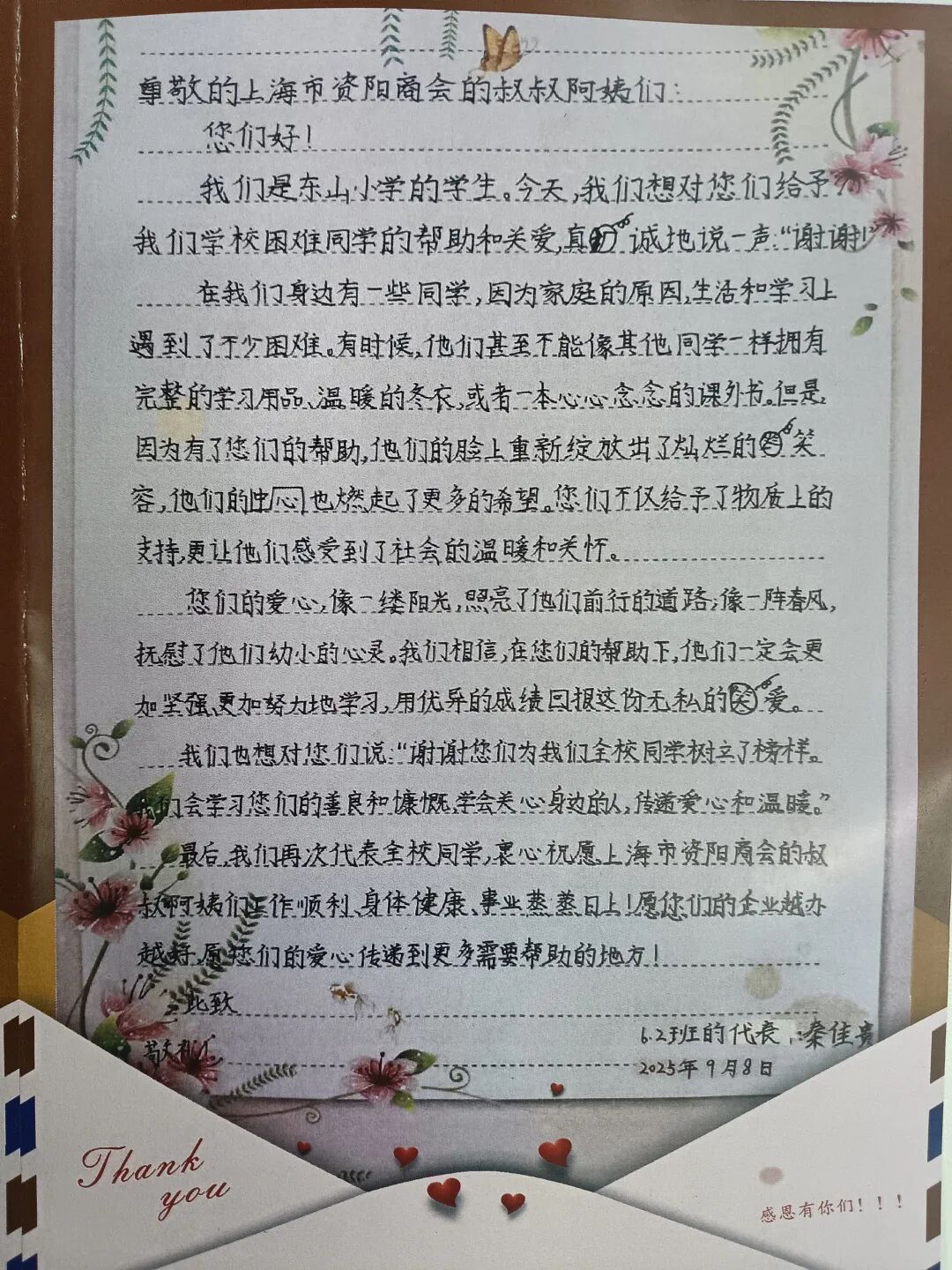东山镇中心小学校的学生代表也亲手写下感谢信,字句真切,感情真挚,表达了对商会叔叔阿姨们深深的感激之情。