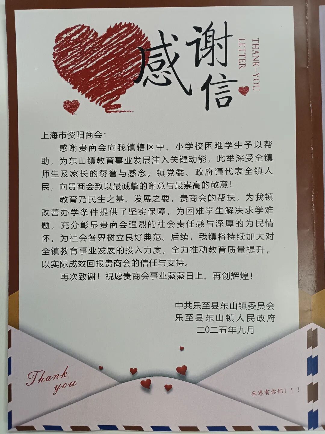 拳拳爱心点燃希望,片片真情托起朝阳。为感谢上海市资阳商会广大会员的爱心善举,中共乐至县东山镇委员会、乐至县东山镇人民政府特地致感谢信,向上海市资阳商会及广大会员表示崇高敬意和衷心感谢。