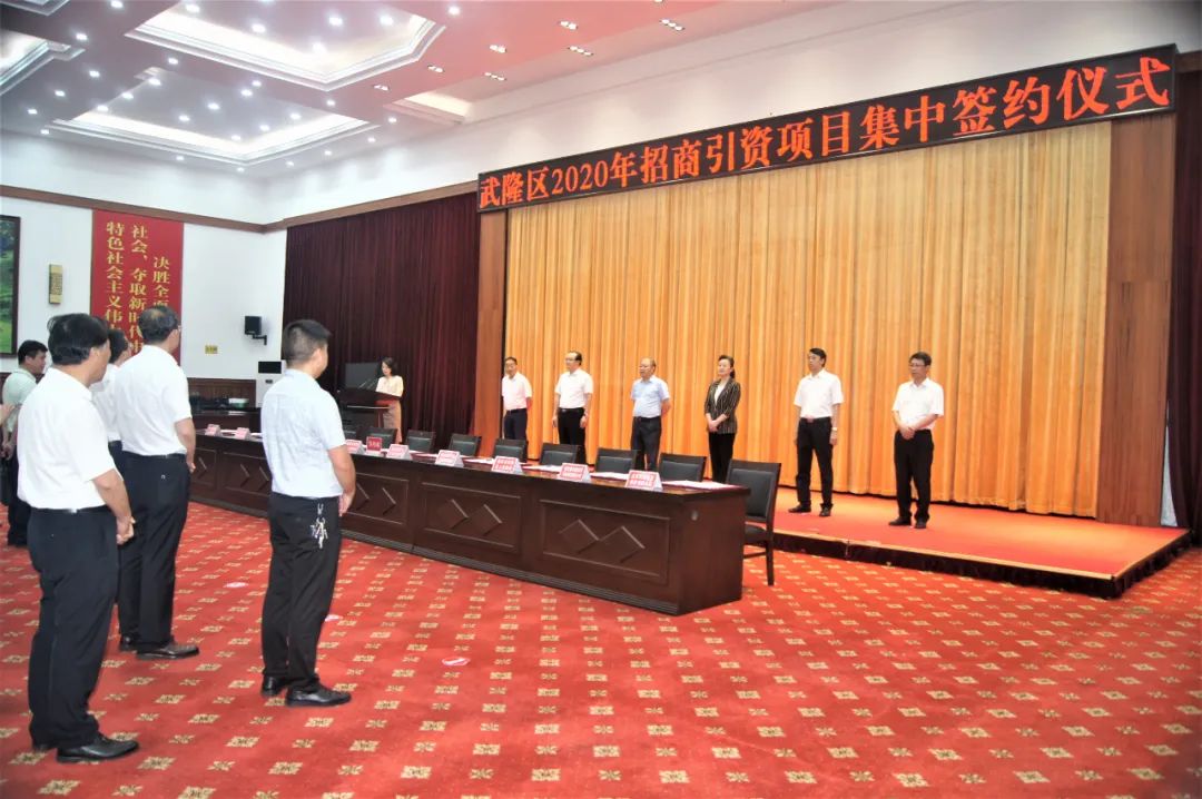 2020年7月2日下午,重庆市武隆区2020年招商项目集中签约仪式在武隆区委会议中心一楼会议室隆重召开。武隆区委书记黄宗华,区委副书记、区政府区长卢红,区委常委、区政府常务副区长胡珍强、区委常委、区政府党组成员周光、区政府副区长刘高永、何林等区级相关部门负责人、区招商小组成员单位负责人等参加签约仪式。商会常务副会长万发连单位——重庆连发文化旅游开发有限公司投资“乌江大峡谷”极限运动基地文化旅游、商会理事赖才源单位——重庆客乐得房车俱乐部有限公司投资“仙女山国际森林教育营地”项目作为本次集中签约项目参加签约。