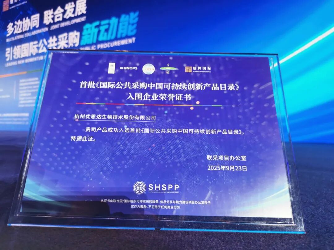 2025年9月23日,由联合国开发计划署、联合国项目事物署、上海市青浦区人民政府主办的"2025中国联合国采购大会"在上海召开。优思达生物作为首批入选《国际公共采购中国可持续创新产品目录》的企业代表,现场接受颁奖并获正式授牌。这一重要时刻标志着优思达的产品创新力和国际竞争力获得联合国采购体系的高度认可。