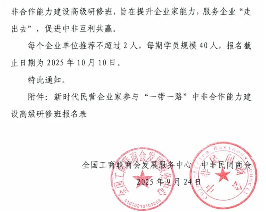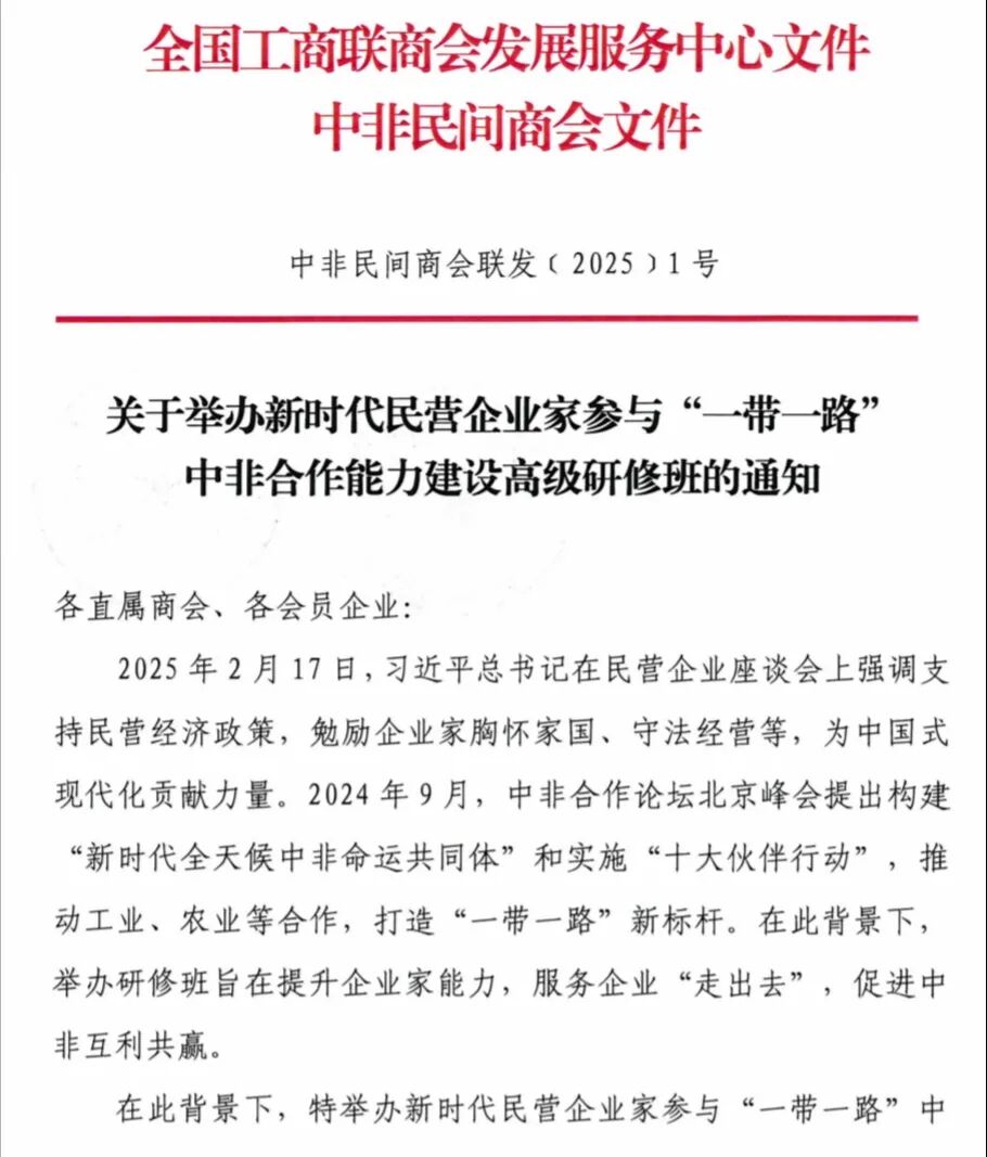 关于举办新时代民营企业家参与“一带一路’中非合作能力建设高级研修班的通知