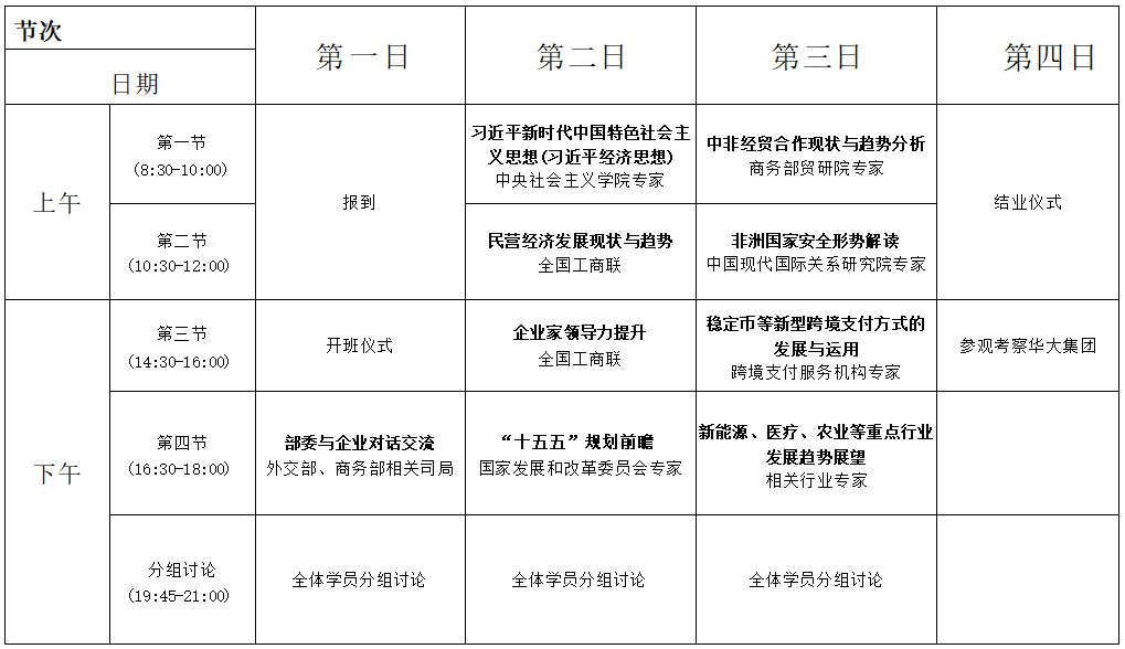 本期培训班计划招生40人,人员构成:中非民间商会企业家 35人,其他相关直属商会企业家5人。