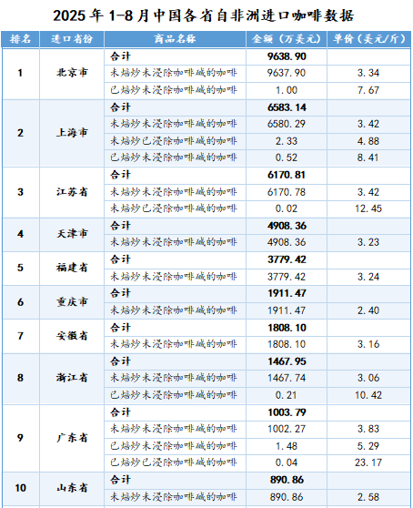 从进口省份分布来看,北京、上海、江苏、天津、福建五省份进口额均超过3000万美元,合计占全国自非咖啡进口总额的78%以上,显示出沿海地区及一线城市是非洲咖啡消费的主力市场。这些地区经济发达、国际化程度高,消费者对咖啡品质和产地来源认知较强,推动了对非洲精品咖啡的需求。