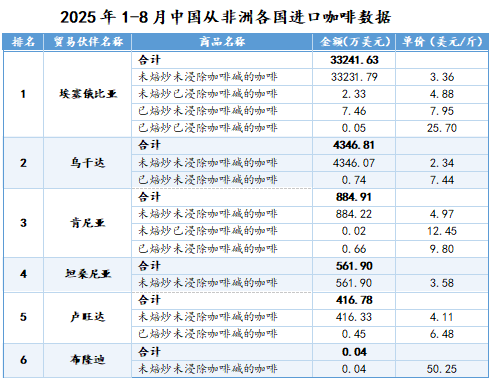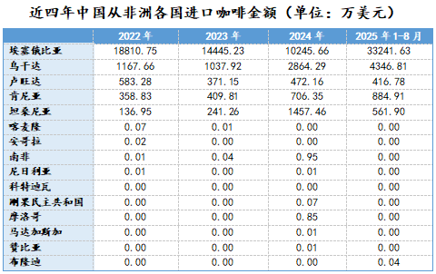 2025年1-8月,中国自非洲进口咖啡金额合计3.95亿美元。埃塞俄比亚以3.32亿美元的进口额遥遥领先,占中国自非咖啡进口总额的84.1%,远超2024年全年的1.02亿美元,呈现爆发式增长。