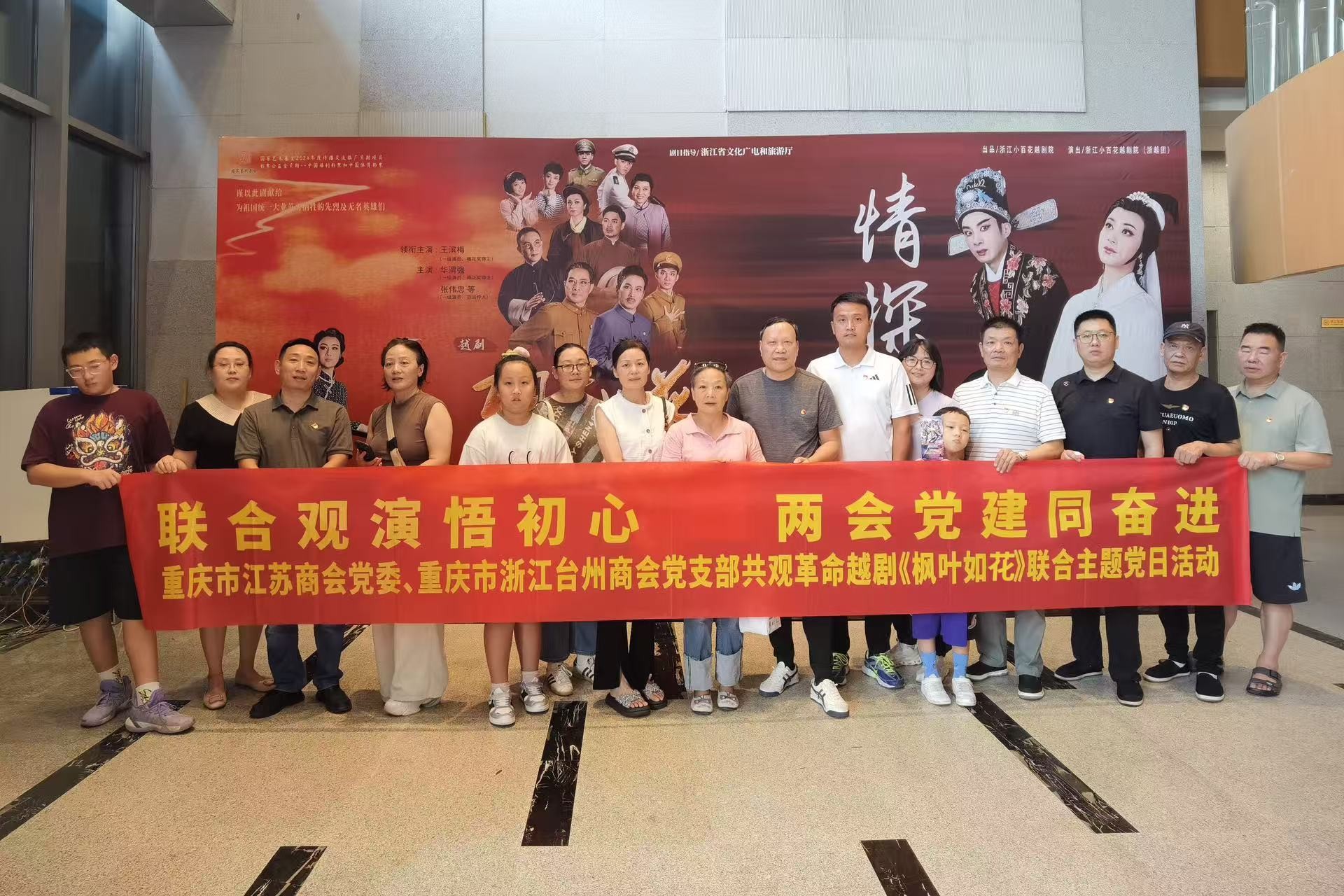 在建军98周年、反法西斯战争胜利80周年之际,重庆市江苏商会党委与重庆市浙江台州商会党支部组织开展了以“联合观演悟初心 两会党建同奋进”为主题的党建联建活动——共同观看由浙江小百花越剧院带来的文华大奖剧目越剧《枫叶如花》。