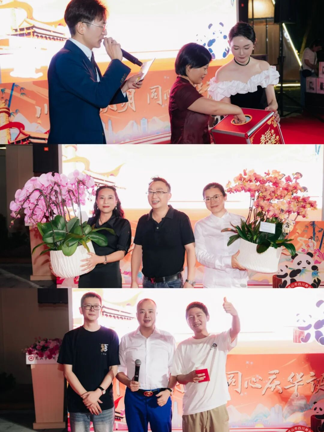 抽奖环节惊喜连连,各类奖品丰厚实用,涵盖洗浴用品、洗牙卡、钓鱼年卡、蝴蝶兰、字画、紫砂壶、虫草礼盒、川味礼盒、保温杯、空调、现金等近60个奖项。每一轮抽奖都引来阵阵欢呼,赞助企业代表纷纷上台揭晓幸运儿,体现了商会内部资源共享、互助共赢的良好生态。