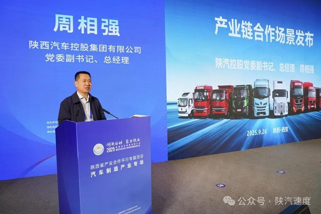 陕汽控股党委副书记、总经理周相强主持会议,并在会上发布陕汽控股产业链合作场景,围绕基本情况、合作展望进行分享,聚焦新能源商用车、智能网联、关键零部件等方向,推动项目精准对接。