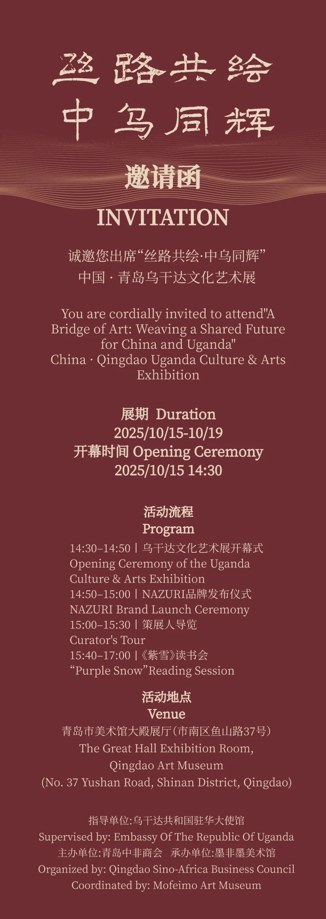 In 2025, it marks the 63rd anniversary of the establishment of diplomatic relations between the People's Republic of China and the Republic of Uganda, and also the 39th anniversary of Qingdao's sister - city relationship with Kampala, the capital of Uganda. In order to thoroughly implement the important instructions of General Secretary Xi Jinping on deepening China - Africa friendly cooperation and serve the new - stage deployment of the 10th anniversary of the Belt and Road Initiative, the Qingdao Sino- Africa Business Councilwill grandly hold the "A Bridge of Art: Weaving a Shared Future for China and Uganda" - China · Qingdao Uganda Cultural &Art Festival at the Qingdao Art Museum from October 15th to 19th, 2025.