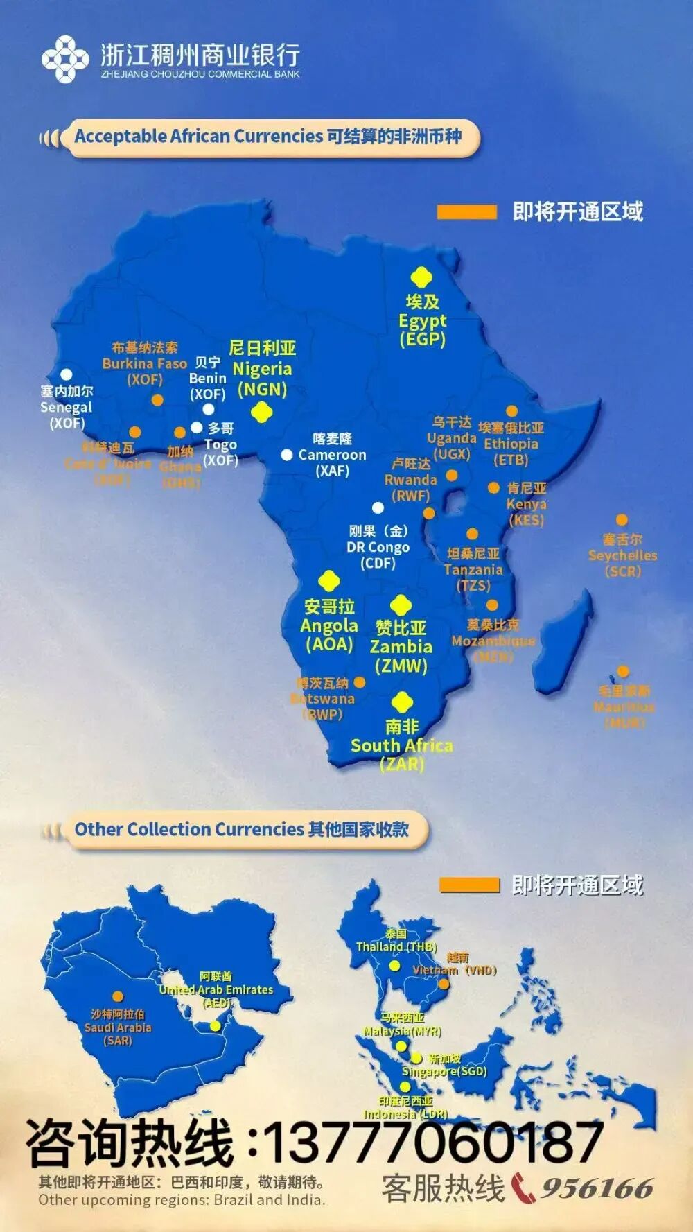 稠州银行支持20个币种的直接清算,覆盖欧美、东南亚、非洲等国家,其中非洲国家有尼日利亚奈拉、赞比亚克瓦查、南非兰特、埃及镑和安哥拉宽扎,资金合规高效。另有博兹瓦纳普拉 BWP、毛里求斯卢比 MUR、乌干达先令 UGX、加纳塞地GHS、肯尼亚先令KES、塞舌尔卢比SCR、坦桑尼亚先令TZS等7个币种的直接清算即将上线。