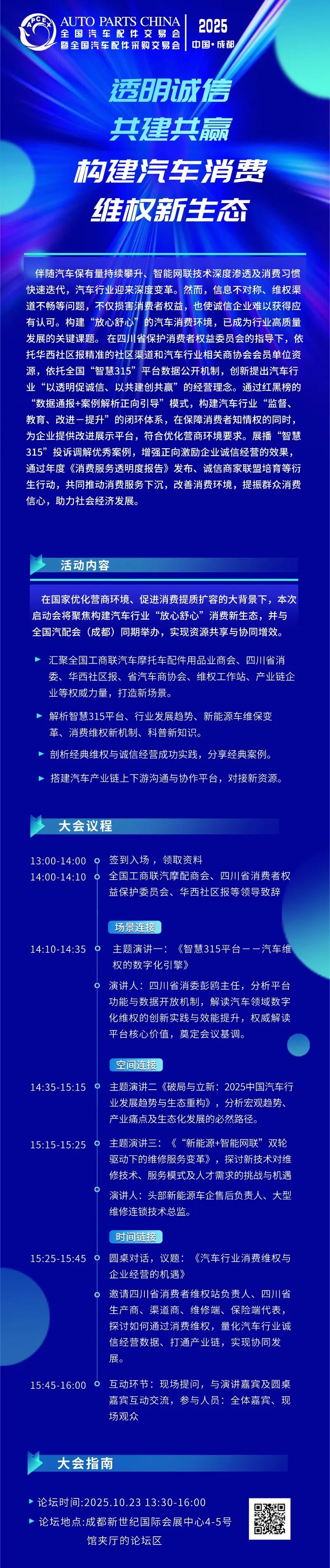 为深入贯彻落实中共中央、国务院《提振消费专项行动方案》精神,旨在有效延伸汽车消费链条、推动消费服务下沉、促进汽车后市场健康发展,全国工商联汽车摩托车配件用品业商会在全国汽车配件交易会暨全国汽车配件采购交易会期间(成都,2025年10月23-25日),将联合地方行业商协会、汽车后市场相关企业,定于10月23日举办“汽车行业诚信驱动消费新生态大会”。本次大会以“破局、立信、共生”为主题,重点推进中消协“智慧315”平台数据公开投诉机制体系建设,倡导“诚信经营,透明消费”,为诚信企业搭建展示平台,改善消费环境,提振消费信心,助力汽车行业新质生产力发展。诚挚邀请各相关单位积极报名参会。现将具体事项通知如下: