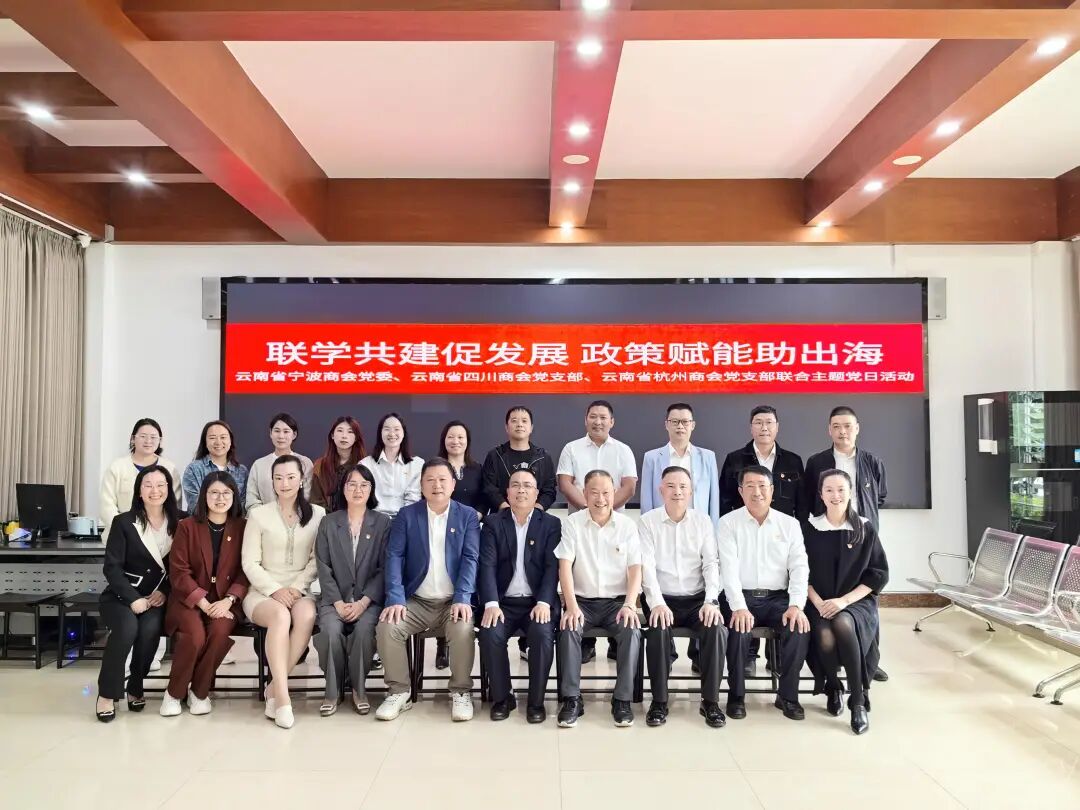 各共建单位党员同志合影留念。今后,云南省四川商会党支部将持续深化与宁波、杭州等兄弟商会间的党建联学共建,引导会员企业把握“一带一路”发展机遇,探索高质量出海路径,在合规经营中拓展南亚东南亚市场,为云南面向南亚东南亚辐射中心建设贡献川商力量。