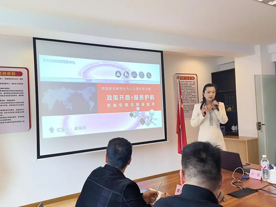 昆明云企出海经贸服务中心理事长楊珮卿作政策解读。她详细介绍了云南省支持企业海外拓展的系列政策,包括海外考察补贴、市场开拓资金、外贸综合服务等,并结合东南亚市场特点,分析了越南、印尼、马来西亚等国家的产业机遇与风险防范要点。