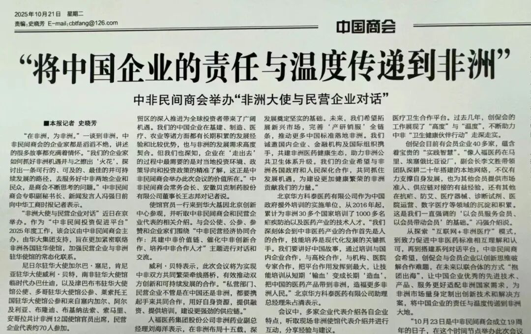 “‘非洲大使与民营企业对话’作为中非民间商会的重点年度会议,已经成为搭建‘大使’与‘企业’直接对话的桥梁。当前,非洲大陆正处于工业化、数字化、绿色化发展的关键阶段,非洲大陆自贸区的深入推进为全球投资者带来了广阔机遇。我们的中国企业在基建、制造、医疗、农业等诸方面都有长期积累的发展经验和比较优势,也与非洲的发展需求高度契合。但我们也深知,企业在‘走出去’的过程中最需要的是对当地投资环境、政策导向和投资政策的精准了解,这正是中非民间商会举办此次会议的价值所在。”中非民间商会常务会长、安徽贝克制药股份有限公司董事长王志邦对记者说。