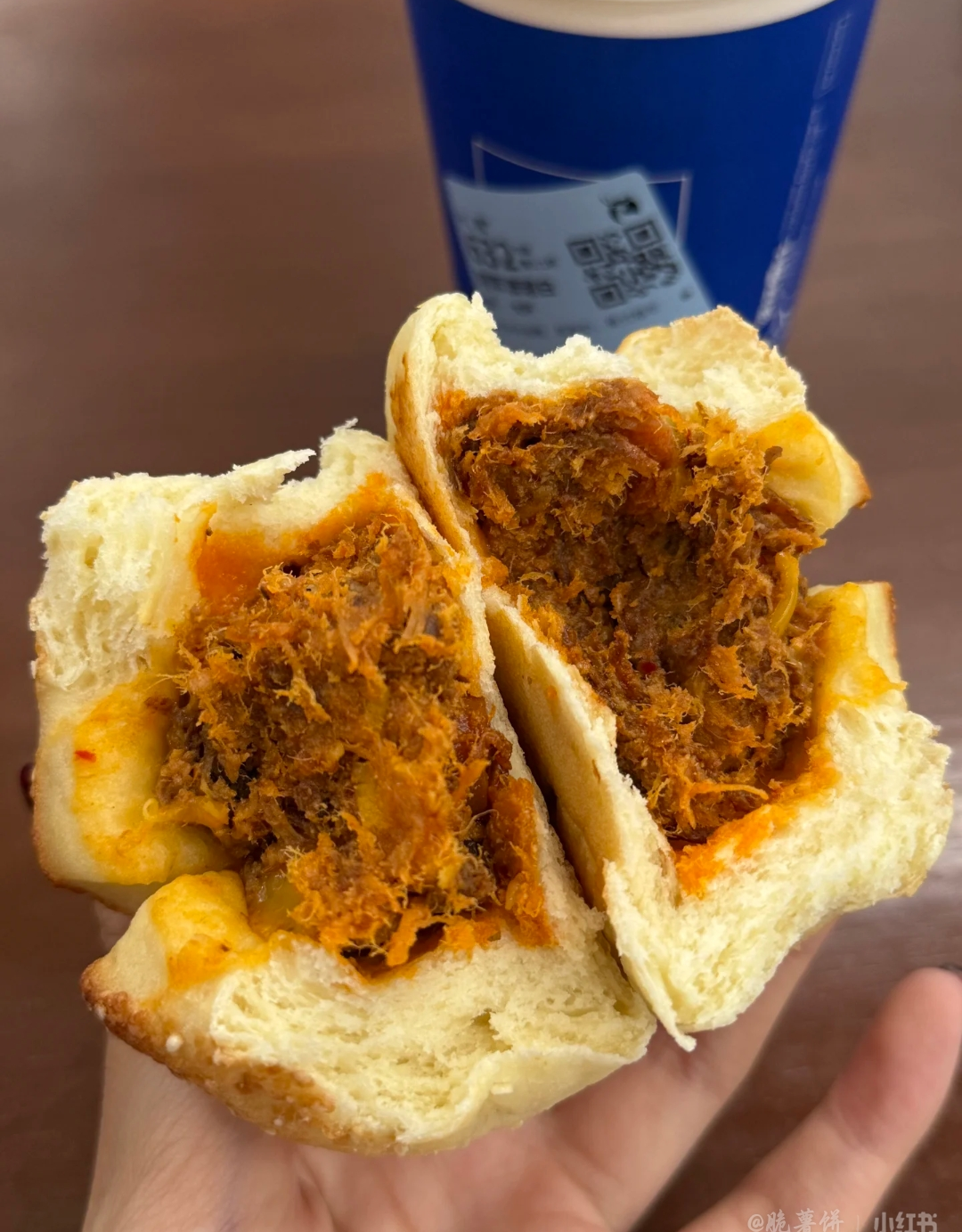 推荐理由:牛肉丝调味偏甜辣,肉松口感内馅扎实,用户反馈“很难不爱。米面包体软糯弹牙。