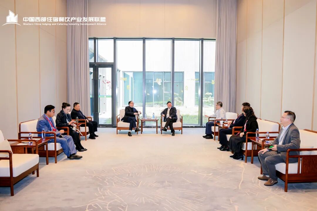 会前,余远牧、彭和良、张进、谢树祥、彭学平、夏国跃、谢廷富等领导进行了愉悦交流。彭学平表示,信用是现代服务业的核心竞争力,促进会将发挥自身在企业信用建设、合规风控等领域的优势,为酒旅行业搭建跨区域信用互认网络,让诚信经营的酒店企业获得更多流量、资本与政策支持,推动行业从“劣币驱逐良币”转向“优信者胜出”,让“信用+酒旅”成为西部酒店业高质量发展的核心引擎,助力重庆建设国际消费中心城市。
