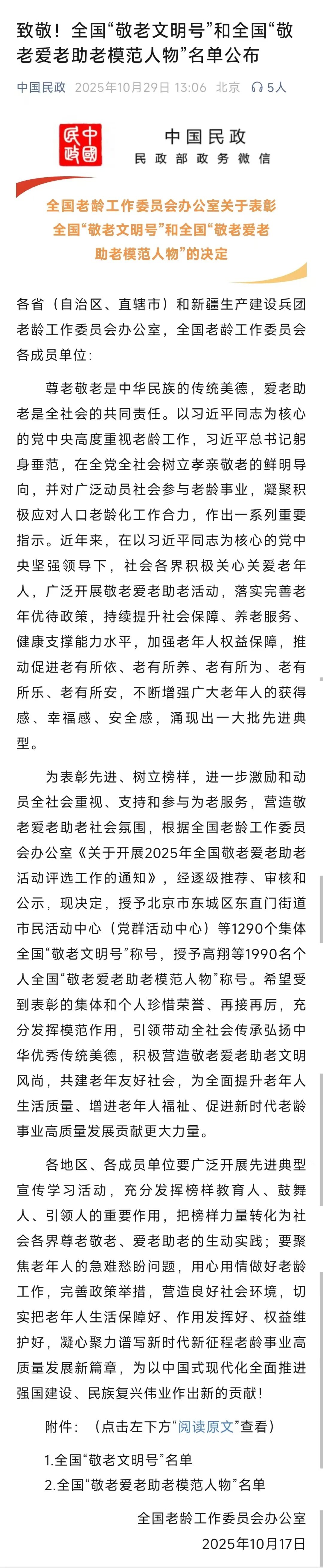 荣获全国“敬老爱老助老模范人物”荣誉称号