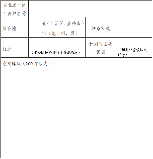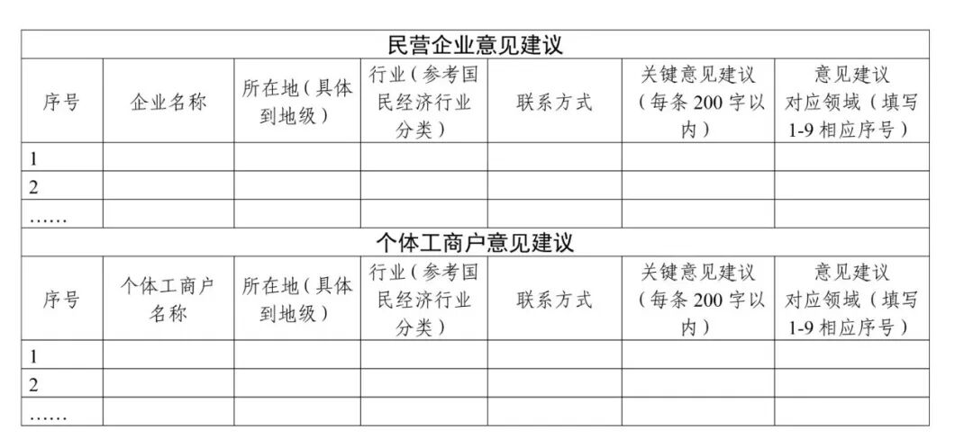 2. 请每家民营企业、个体工商户结合实际,针对某一领域(见附件1)提出1条意见建议,字数在200字以内。同时提供企业(个体工商户)名称、所在地(具体到地级)、行业、联系方式。