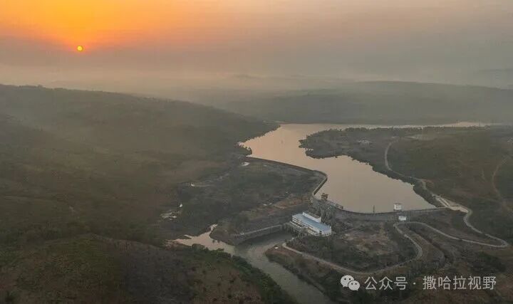 这是2025年4月25日在几内亚杜布雷卡省拍摄的日出时分的凯乐塔水电站(无人机照片)。