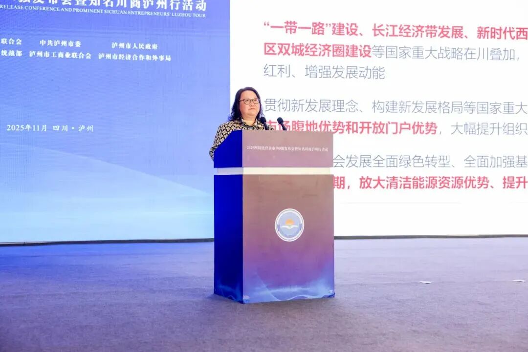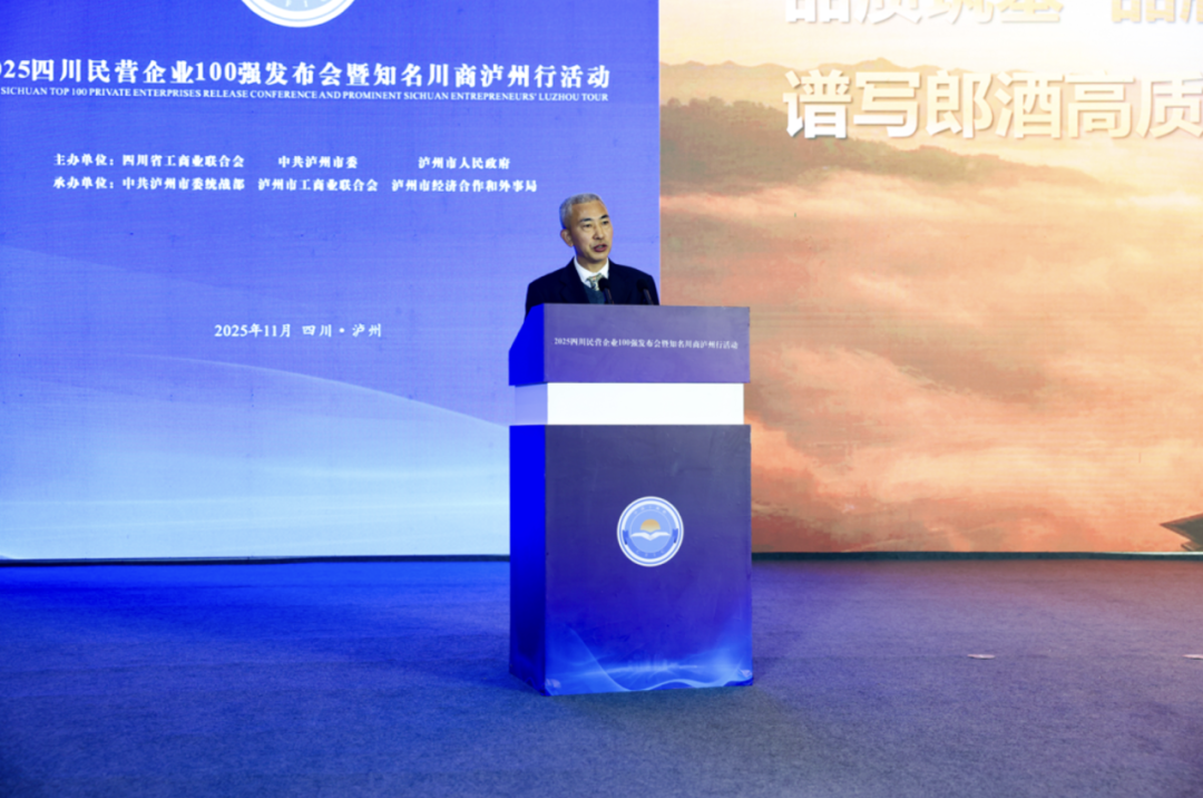 11月6日,由四川省工商联(省总商会)、中共泸州市委、泸州市人民政府主办的2025四川民营企业100强发布会暨知名川商泸州行活动圆满举行。省工商联主席、省总商会会长唐燕发布2025四川民营企业100强、制造业100强、服务业50强、研发投入100家四个榜单和调研分析报告,省发展改革委党组成员、副主任李明騄,科技厅党组成员、副厅长刘菊蓉,商务厅副厅长刘建成,经济和信息化厅二级巡视员周勇参会并发言,泸州市委副书记、市长张伟致辞,省工商联党组成员、副主席孙宁主持会议。