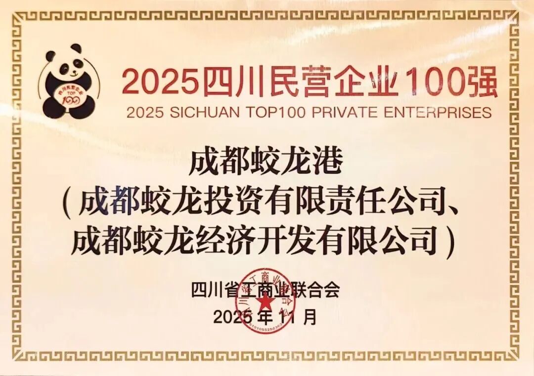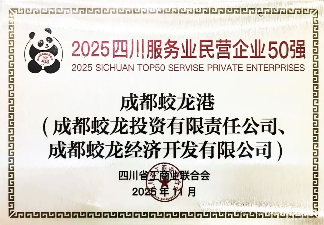 四川省重庆商会名誉会长单位成都蛟龙港,副会长单位亿胜集团再次荣登四川民营企业100强榜单。同时,成都蛟龙港还荣获2025四川服务业民营企业50强殊荣。