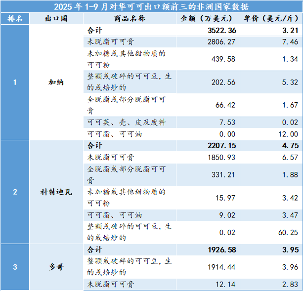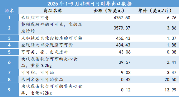 2025年1-9月,中国自非洲进口可可总额达9319.92万美元,反映我国对非洲可可供应链的稳定依赖。