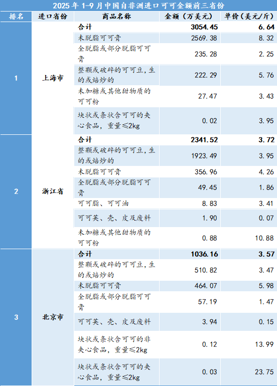 上海市以3054.45万美元居首,平均单价6.64美元/斤也为各省市最高,未脱脂可可膏占其进口额的84.1%,凸显其作为高端加工与贸易核心枢纽的地位。