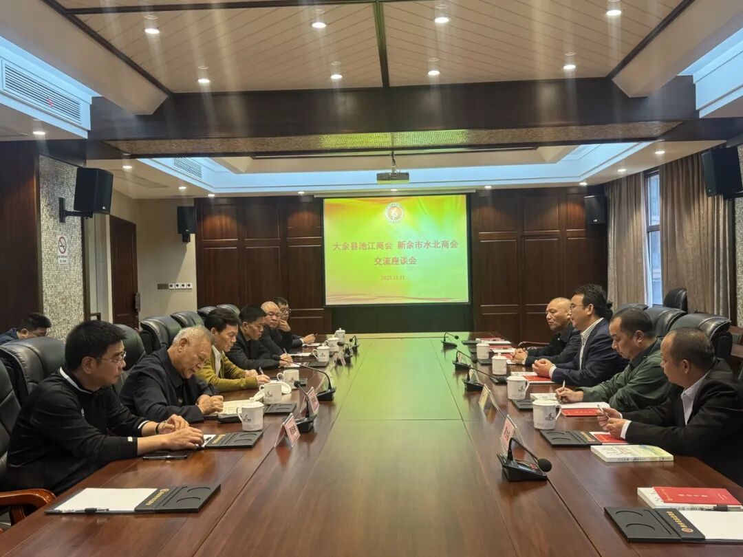 2025年11月11日下午,赣州市大余县池江商会会长黄邦祥带领执行会长叶小福,秘书长黄全福和监事长刘东胜一行莅临水北商会,开展交流学习活动。水北商会党委书记邹细保,党委副书记、常务副会长陈木生,党委专职副书记简蜂,副会长袁晨平、张勇勇,总顾问何华武等热情接待了来访嘉宾。