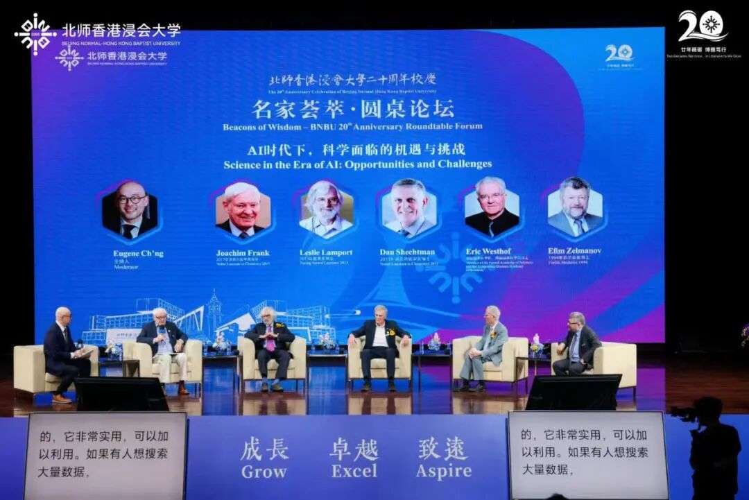 开幕式上,北师香港浸会大学校董会主席、北京师范大学常务副校长王守军,香港浸会大学校董会主席黄英豪,香港浸会大学校长卫炳江等分别致辞。创校校长吴清辉、第二任校长汤涛共同回顾学校发展历程,校长陈致系统汇报学校建设成果,展现其在融合育人、学科创新与跨文化教育方面的探索与实践。期间还举办了“AI时代下科学的机遇与挑战”圆桌论坛,诺贝尔化学奖、图灵奖、菲尔兹奖得主等多位国际顶尖学者共聚一堂,围绕科技创新与产业变革展开深度对话和探讨。