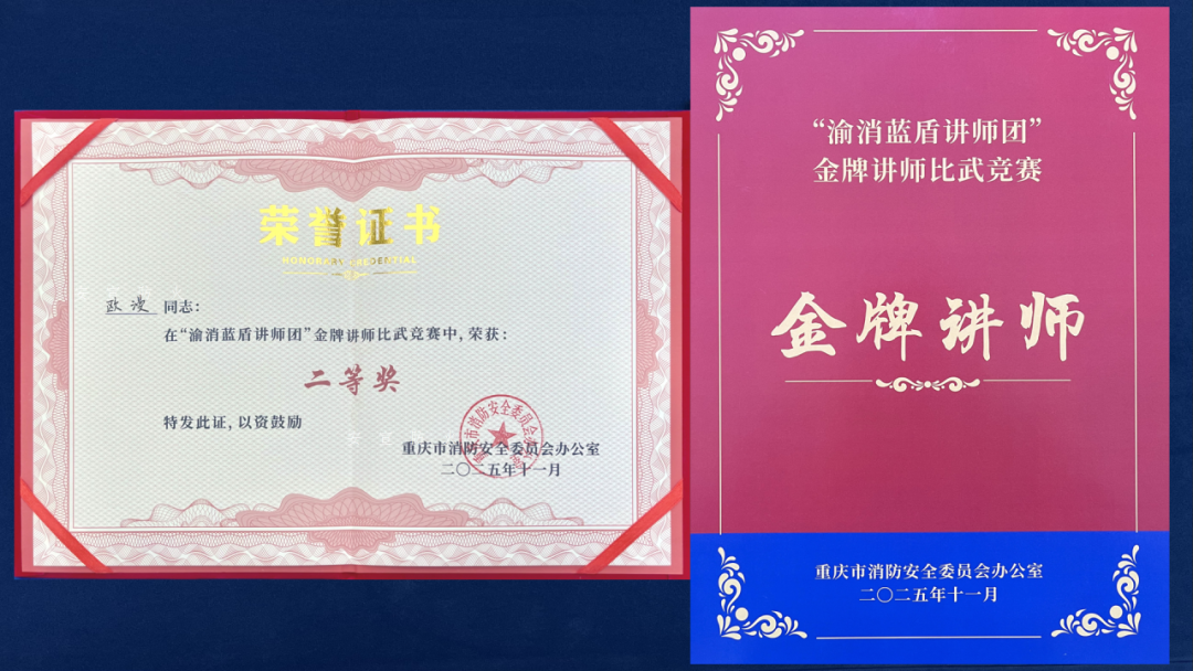 我会理事、川商青委会党支部书记单位——重庆安宣防火中心高级教员欧漫宣讲的《医疗机构临床科室日常防火注意事项及先期应急处置》课题,凭借精心的准备和扎实的专业知识、精湛的宣讲技巧和卓越的现场发挥,赢得了现场评委与听众的高度认可,最终以 93.33分 的优异成绩,勇夺大赛第二名,并被重庆市消防安全委员会办公室正式授予 “金牌讲师” 荣誉称号!