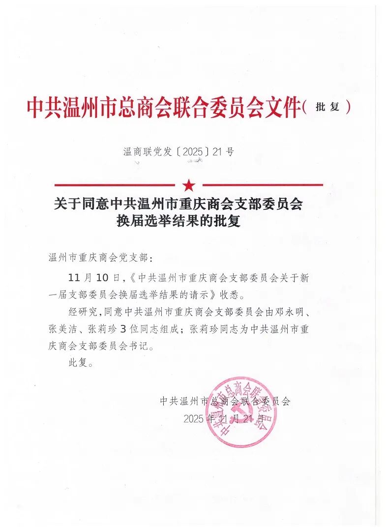 为进一步加强基层党组织建设,充分发挥党支部战斗堡垒作用和党员先锋模范作用。11月8日,中共温州市重庆商会支部委员会召开党员大会,根据中共温州市总商会联合委员会【2025】10文件《关于同意中共温州市重庆商会支部委员会换届选举的批复》,选举产生新一届支部委员会,张莉珍同志主持大会。