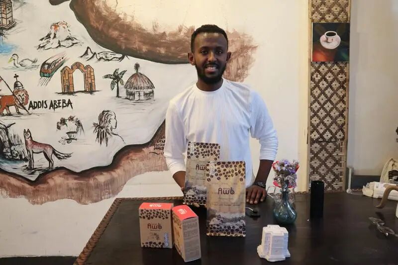 10月26日,在埃塞俄比亚首都亚的斯亚贝巴,工作人员展示AWO咖啡公司的产品。