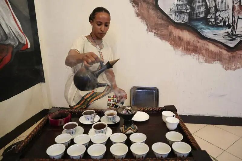 10月26日,在埃塞俄比亚首都亚的斯亚贝巴,AWO咖啡公司工作人员展示埃塞俄比亚传统咖啡仪式。