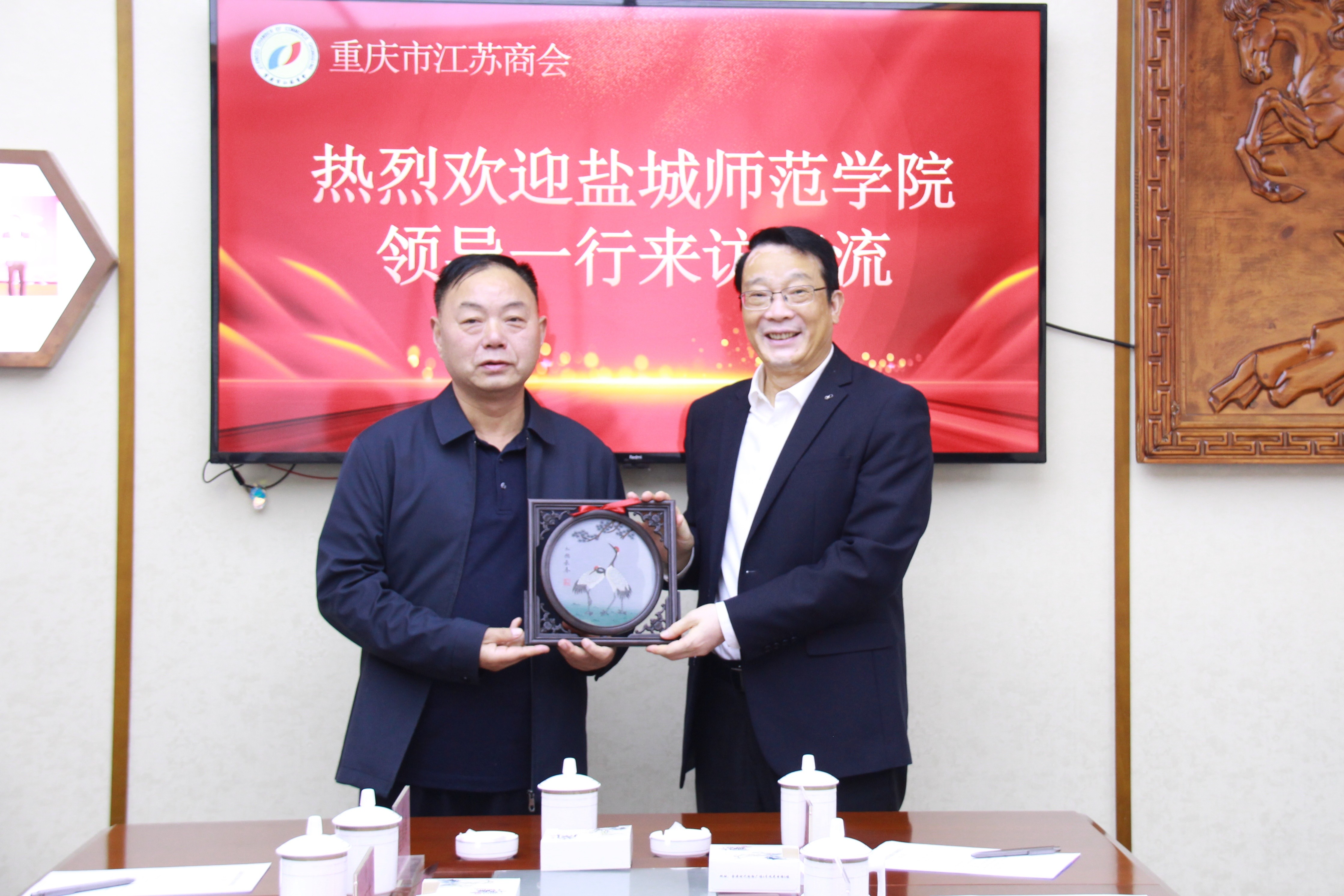 座谈会由商会秘书长赵林森主持。双方首先介绍了参会人员,共同观看了重庆市江苏商会的宣传片,初步了解了商会的发展历程、组织架构与取得的成绩。随后,张玉勤书记代表盐城师范学院向商会赠送了极具江苏地方文化特色的珍贵纪念品——“江苏东台发绣”,寓意情谊绵长,合作生根,体现了浓浓的乡情与文化传承。