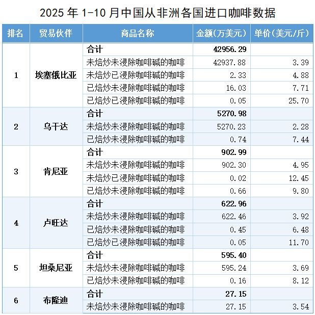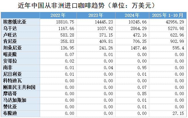 根据海关总署数据显示,2025年1-10月,中国从埃塞俄比亚、乌干达、卢旺达等非洲国家进口咖啡总额约 5.04亿美元,相较于前几年呈现显著增长。从历史趋势看,埃塞俄比亚、乌干达等主要来源国在2022—2025年间进口额波动上升,尤其是埃塞俄比亚在2025年1-10月进口额达 4.30亿美元,远超2024年全年水平,显示其在中国咖啡进口中的地位进一步巩固。