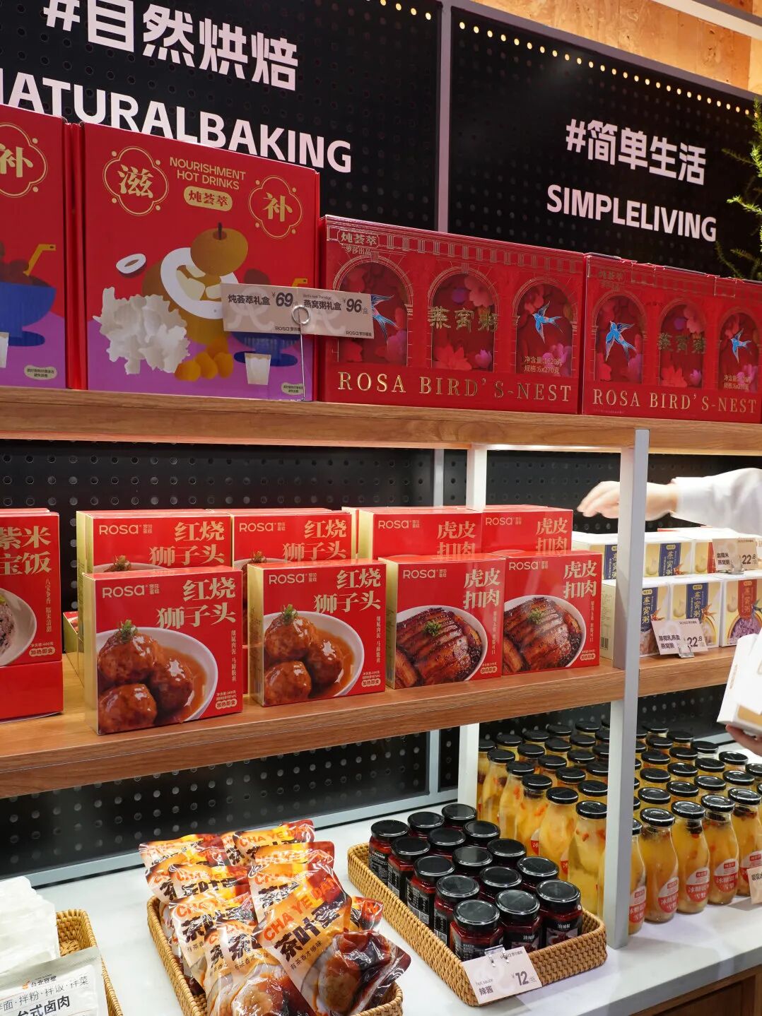 在罗莎蛋糕的门店,专门有个货架来陈列售卖日常餐食调料、经典菜系自热包和节庆滋补速食礼盒——这是罗莎台北豆浆2022年开始餐饮零售化的进程的产物,依托于三百余家烘焙门店进行零售,借助罗莎蛋糕的渠道铺货能力、用户触达能力和品牌效应带来企业的总体增长。