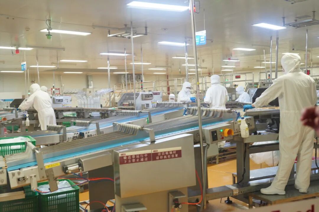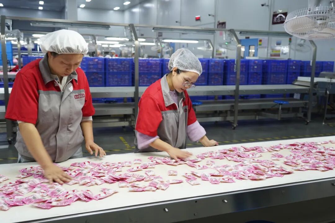 30万级空气净化的生产车间明亮通透,设备有序运转,工人规范操作,展现出标准化食品工业的严谨与活力。