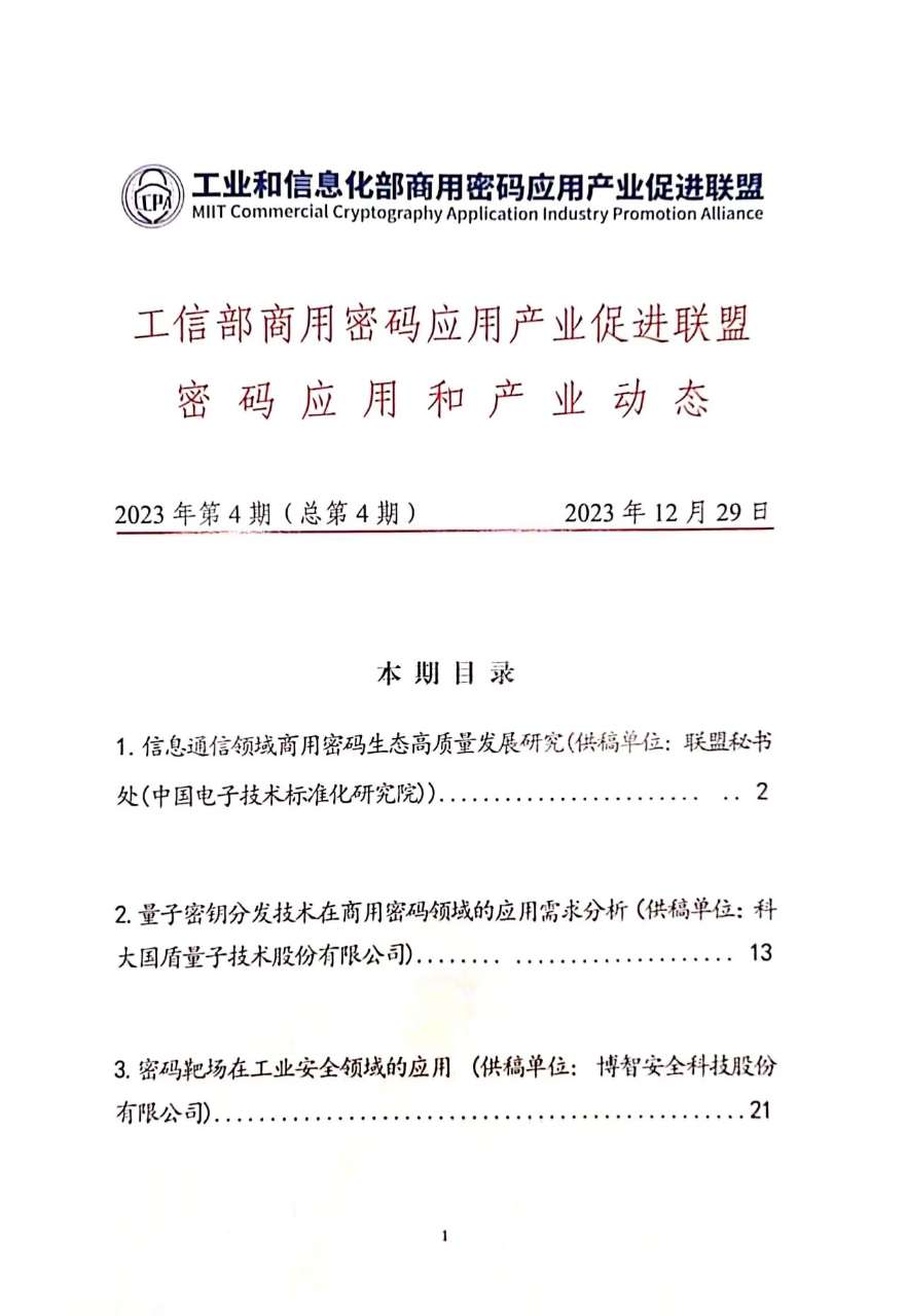 工业和信息化部商用密码应用产业促进联盟(以下简称“工信商密联盟”)编制工信领域商用密码应用和产业动态2023年第4期专报。博智安全科技股份有限公司(以下简称“博智安全”)作为网络靶场领军企业,协同参与专报编制工作,利用靶场核心技术赋能密码产业。