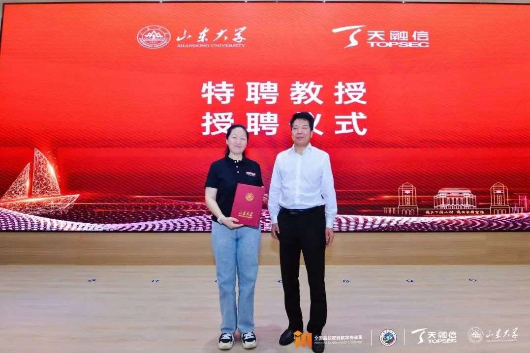 在校企合作仪式上,天融信科技集团董事长兼CEO李雪莹正式受聘为山东大学兼职特聘教授,聘期三年。山东大学副校长、青岛校区校长曹现强为其颁发聘书。 他提到,李雪莹的加入必将为学校网络安全学科的发展注入新的活力和动力,推动双方在人才培养、学术研究、成果转化等方面取得更加丰硕的成果。