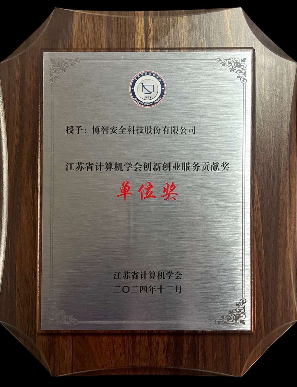 在第十四届江苏省计算机大会JSCS2025颁奖典礼上,博智安全多方位支持江苏省计算机学会创新创业活动,凭借优秀的工作成果,被授予“江苏省计算机学会创新创业服务贡献奖单位奖”。