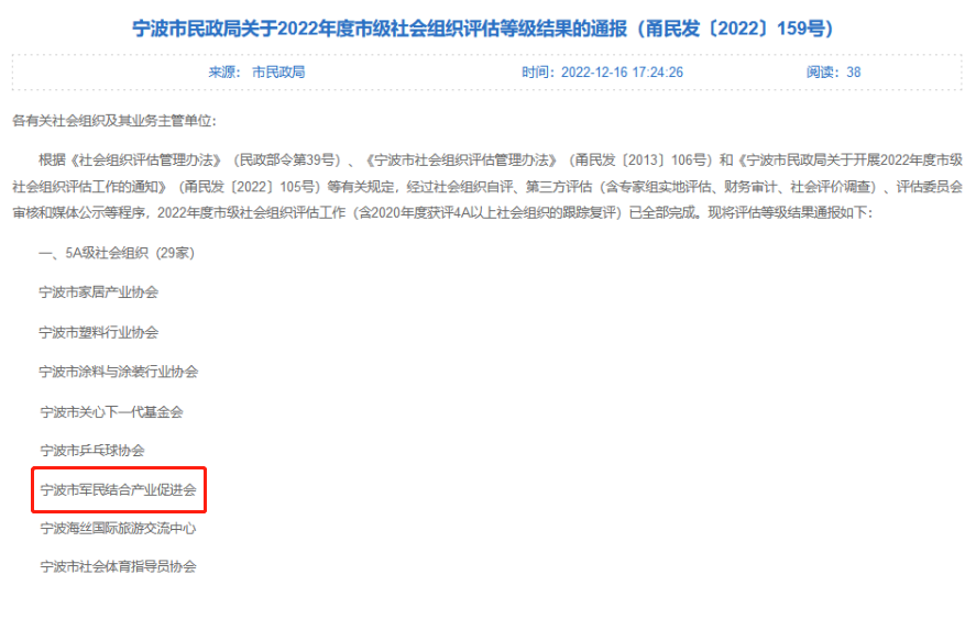 近日,宁波市民政局发布关于2022年度市级社会组织评估等级结果的通报,经社会组织自评、第三方评估(含专家组实地评估、财务审计、社会评价调查)、评估委员会审核和媒体公示等程序,宁波市军民结合产业促进会被评定为5A级社会组织。