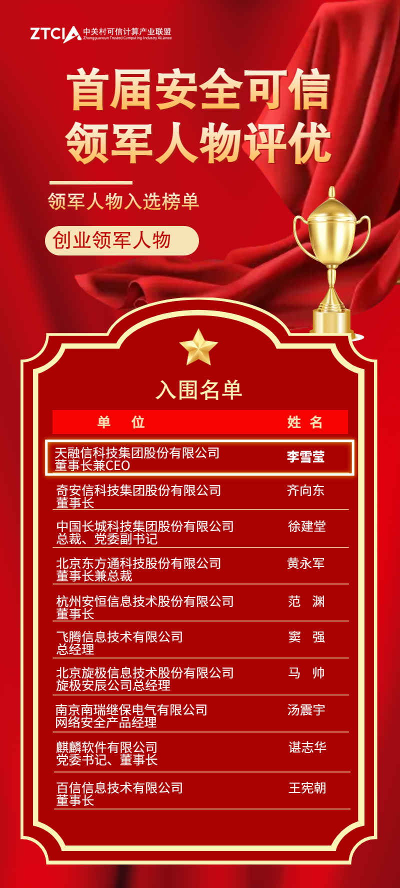 据了解,评优活动旨在推进可信计算产业结构的优化升级,全面提高可信计算领域的自主创新能力,扩大可信计算产业联盟的社会知名度和行业影响力。自评优启动以来,得到联盟会员单位和社会各界的大力支持和积极响应。为确保活动的严谨性和专业性,经过严格的专家评审和媒体评审,天融信作为网络安全行业的领军企业,从申报“安全可信领军人物”的37位企业负责人以及申报“安全可信解决方案”的50家企业中脱颖而出,斩获“安全可信领军人物”、“安全可信解决方案”两大奖项。