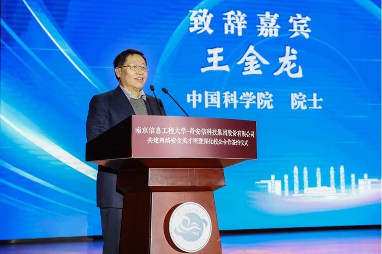 中国科学院院士王金龙,江苏省委网信办副主任王万军,江苏省公安厅网络安全保卫总队监控支队政委张久栋,南信大党委书记管兆勇,副校长韦忠平、陈海山,奇安信集团总裁吴云坤,副总裁韩争光、陈明,江苏总经理梁辉,南信大相关职能部门、学院负责人,导师代表,奇安信集团员工代表,计算机学院师生代表,奇安信英才班学生代表出席大会。大会由陈海山主持。